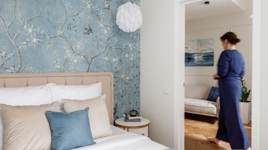 Ощущение уголка сада появляется уже в зоне ожидания — там нашли свое место садовое кресло и журнальный стол Ньюман от divan.ru, которые стоят под деревом в кадке. Обстановку дополнили винтажным комодом, выкрашенным в черный цвет.