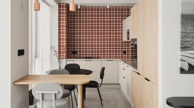 Почти вся мебель выполнена под заказ по эскизам автора. Диван с рисунком гусиная лапка отлично вписался в созданный интерьер. Мы долго выбирали ткань для дивана. Важно было найти что-то спокойное, но в тоже время с красивым рисунком. В моменте подбора ткани родилась такая идея. Мы хотели, чтобы раскладка плитки пересекалась незаметно с рисунком ткани дивана. И мы нашли у компании Диван.ру именно то, что нам нужно. Как сказал менеджер магазина Диван.ру, мы первые, кто заказал диван с такой тканью. Пришлось, конечно, ждать больше, чем если бы мы выбрали стандартную комплектацию. Но ожидание оправдалось. Заказчики были довольны.