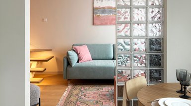Пол в санузле выложили керамогранитом с эффектом терраццо. Нижнюю часть стен облицевали плиткой под бетон, верхнюю покрыли изумрудной краской для влажных помещений. Зону туалета отделили полупрозрачной перегородкой с рифленым стеклом в золотом обрамлении. Золото присутствует и в других деталях.