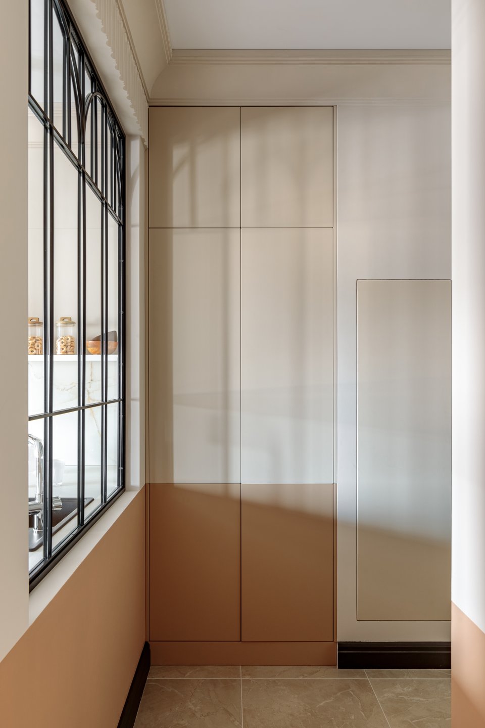 Высота гарнитура на этой кухне — три метра. До верхних шкафов добраться достаточно сложно, но потолок в этом месте решили не опускать. Фасады в эмали окрашены в сложный оттенок. Часть фасадов в шпоне с раскладкой «елочка», которая добавляет динамики.