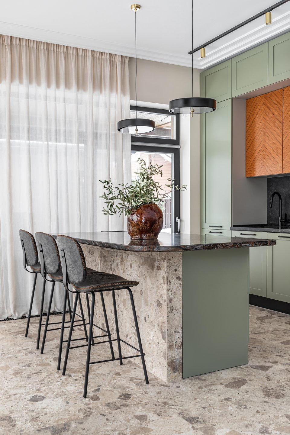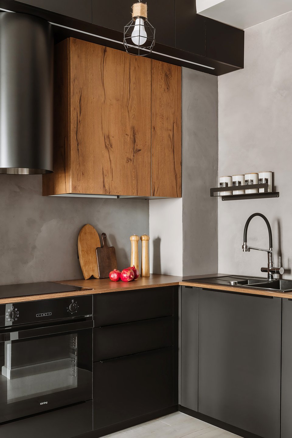 На этой кухне реализовали смелые идеи по цвету и материалам: черные фасады мебели, микроцемент, яркие акценты. Гарнитур выполнен на заказ, размеры шкафов стандартные — 45 и 60 см глубиной. Нижние секции выкатные. Всю редко используемую кухонную технику и посуду разместили в антресольном ряду шкафов.