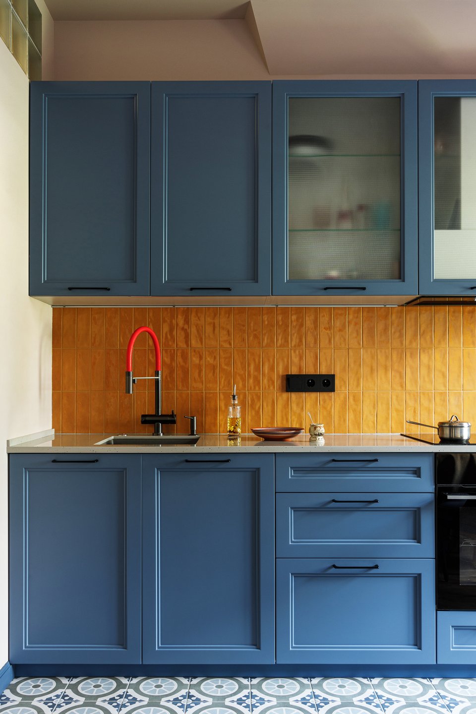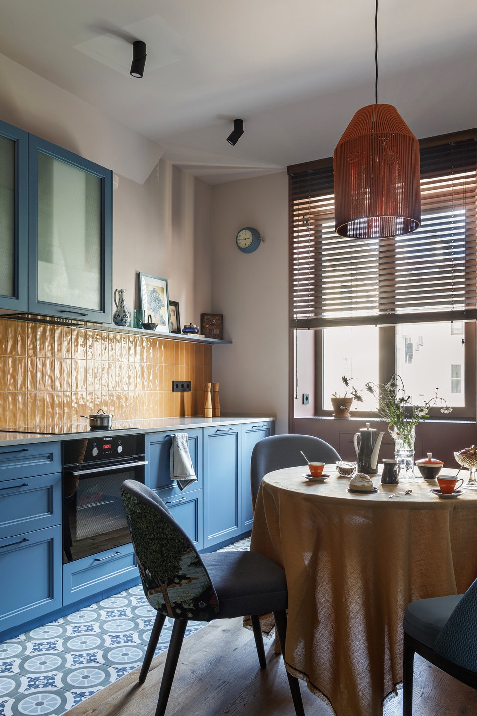 Глубокий синий цвет приходит в эту кухню из прихожей — плавно перетекает на одну из стен. Гарнитур напротив такого же оттенка, он контрастирует с горчичной плиткой на фартуке. Блок окна тоже выделен цветом, но уже бежево-серым. Под ним аккуратно встроен шкаф-холодильник.