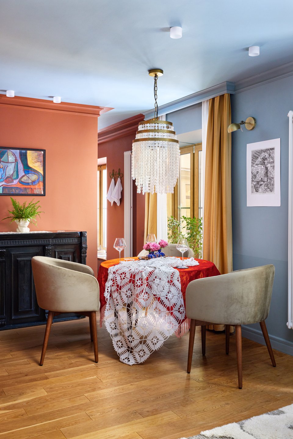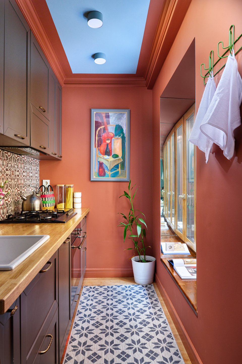 В детстве хозяйка этой квартиры Эльнара много времени проводила в Азербайджане — ей захотелось добавить сочные, спелые оттенки в свою питерскую квартиру. Теперь на стенах здесь терракотовая краска, потолок — светло-голубой, а яркий интерьер восполняет нехватку солнца в северной столице.