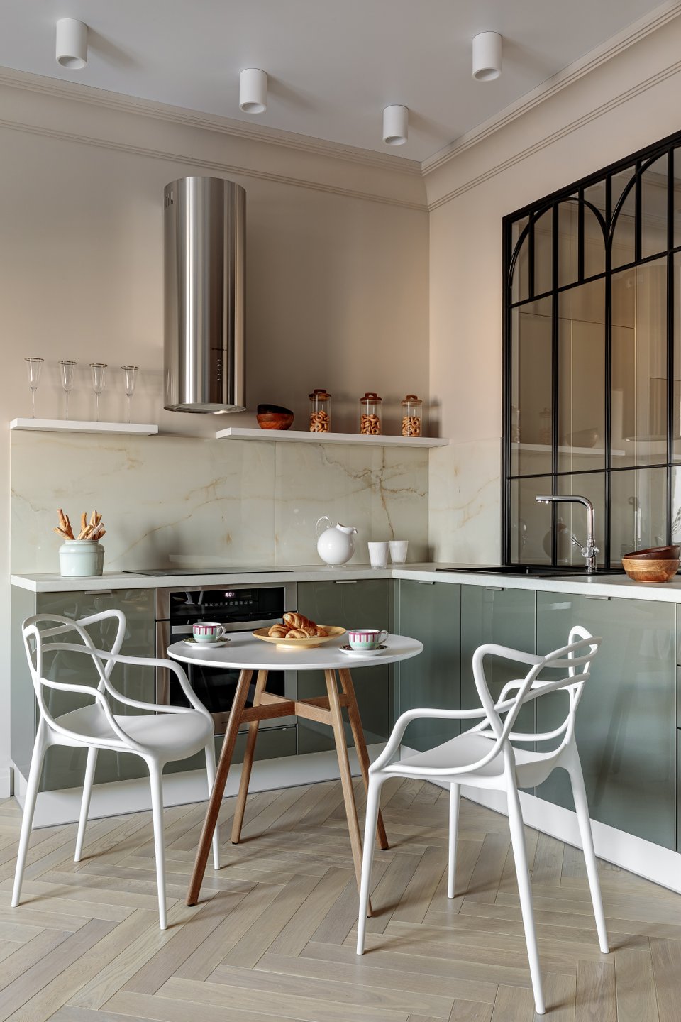 Необычное решение в этой кухне-гостиной — окно между комнатой и прихожей, через которое в холл проникает естественный свет. Стены выведены под покраску и выкрашены в два тона, чтобы расширить границы восприятия. Мебель дополняет декор и колористику стен. На пол лежит дубовый паркет — по словам хозяйки, нет ничего приятнее, чем ходить по нему босиком.
