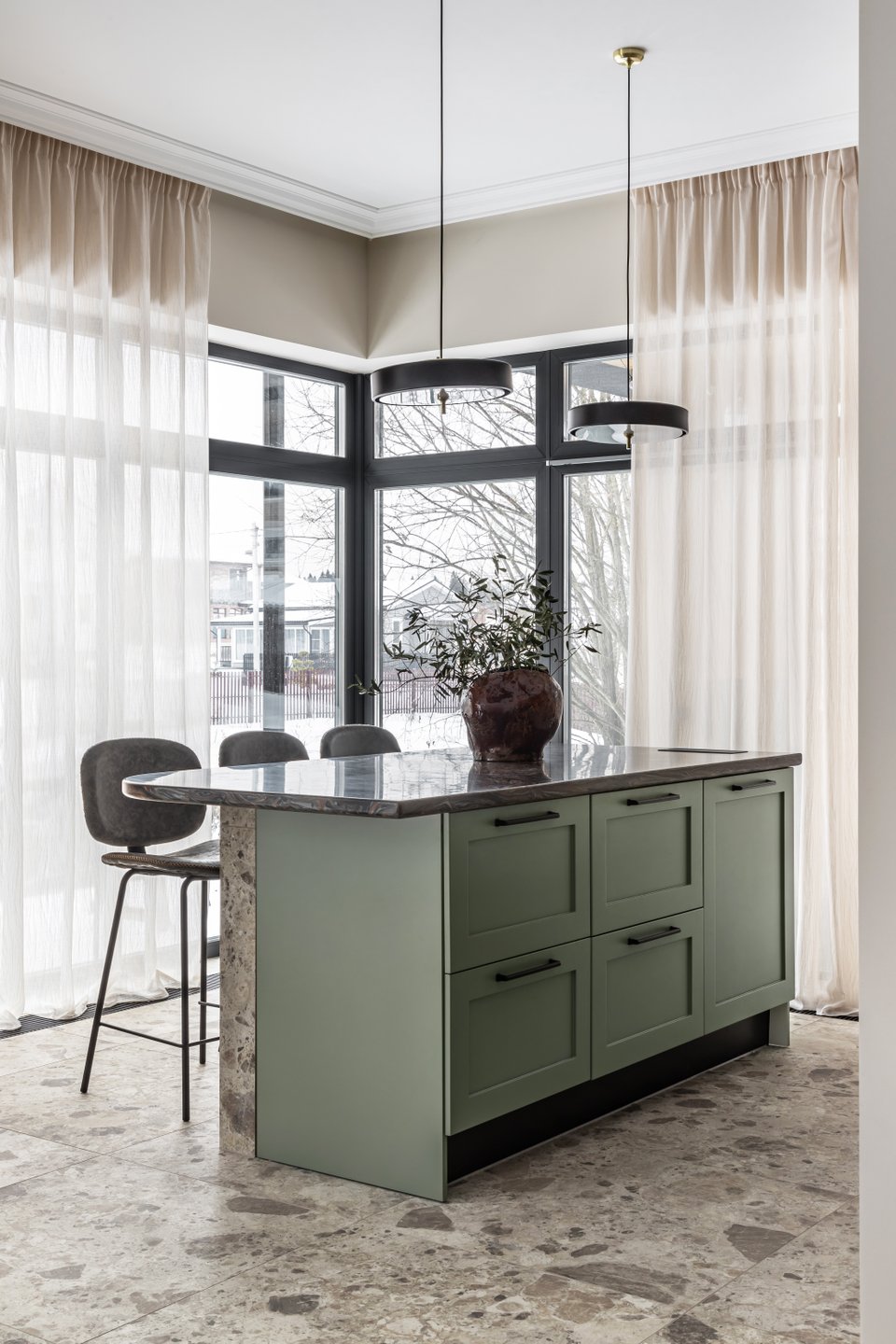 В кухне есть встроенный холодильник, посудомоечная машина на 60 см, тройная варочная панель, колонна со встроенной техникой (СВЧ-печь и духовой шкаф). Посуда хранится в нижних выдвижных ящиках. За островом семья собирается на завтраки, обеды и ужины.