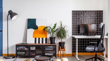 В этом проекте сделали ставку на смелые цвета и солнечное настроение, поэтому стену в ТВ-зоне оклеили красочным панно. Тропические заросли на акцентной стене отвлекают внимание от «черного квадрата» и визуально растворяют технику в интерьере.