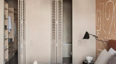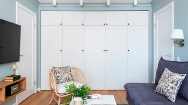 Полноценную гардеробную дизайнеры рекомендуют проектировать в спальне размером не менее 18 кв. м, а шкаф-гардеробная поможет решить эту проблему и в маленькой комнате. Такой вид мебели можно считать еще одной разновидностью встроенного шкафа. По виду он может напоминать шкаф-купе с раздвижными дверцами. А по факту внутри будет гардеробная с П-образно расставленной мебелью, штангами, полками, ящиками — идеальная компоновка для хранения одежды и постельных принадлежностей разного типа. Оттенок шкафа должен гармонировать по тону с базовыми цветами в интерьере или контрастировать, если у него акцентная роль. Хорошо, если на стадии проектирования заложена подсветка: когда шкаф открывается, будет включаться освещение.