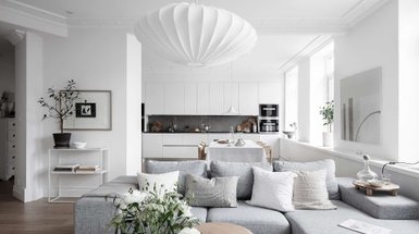 Добавление белого придает обстановке воздушности. Вариант подходит для зала или спальной комнаты. Чтобы интерьер смотрелся теплее, можно разбавить цветовую палитру желтым, рыжим, зеленым тонами. Примером может служить интерьер, где стены выкрашены светлой краской, текстиль подобран в бирюзовых оттенках с небольшими мятными акцентами. Вместо белого можно взять любые его оттенки: молочный, карамельный, жемчужный, песочный.