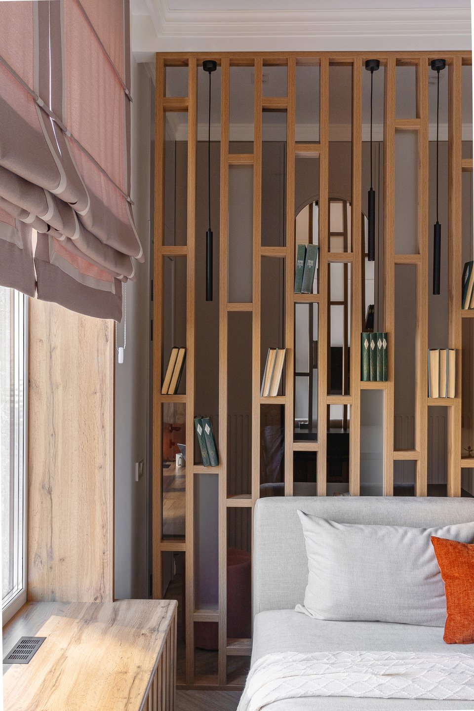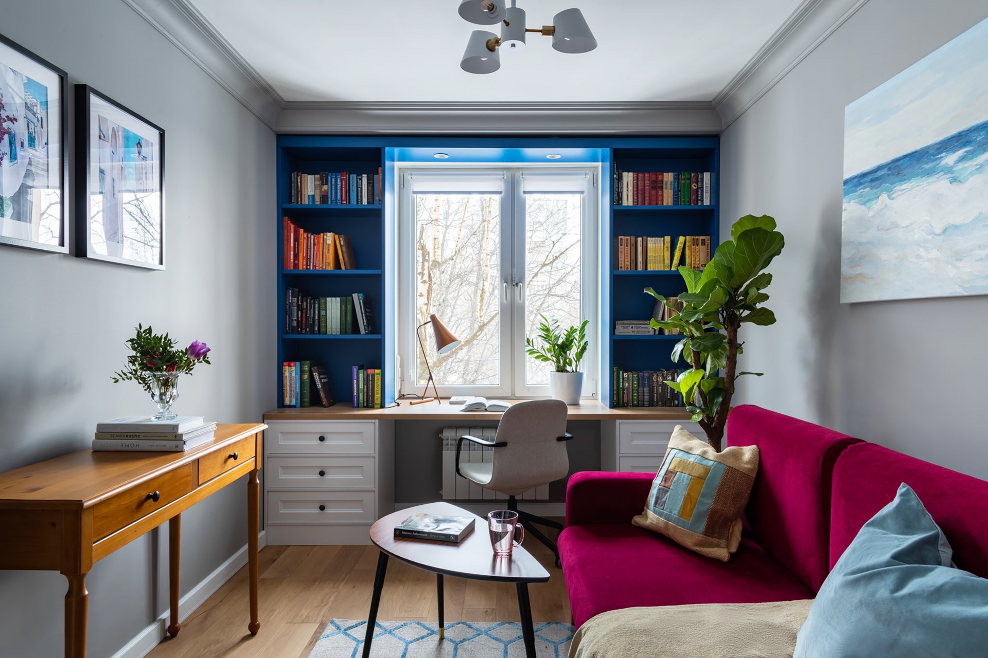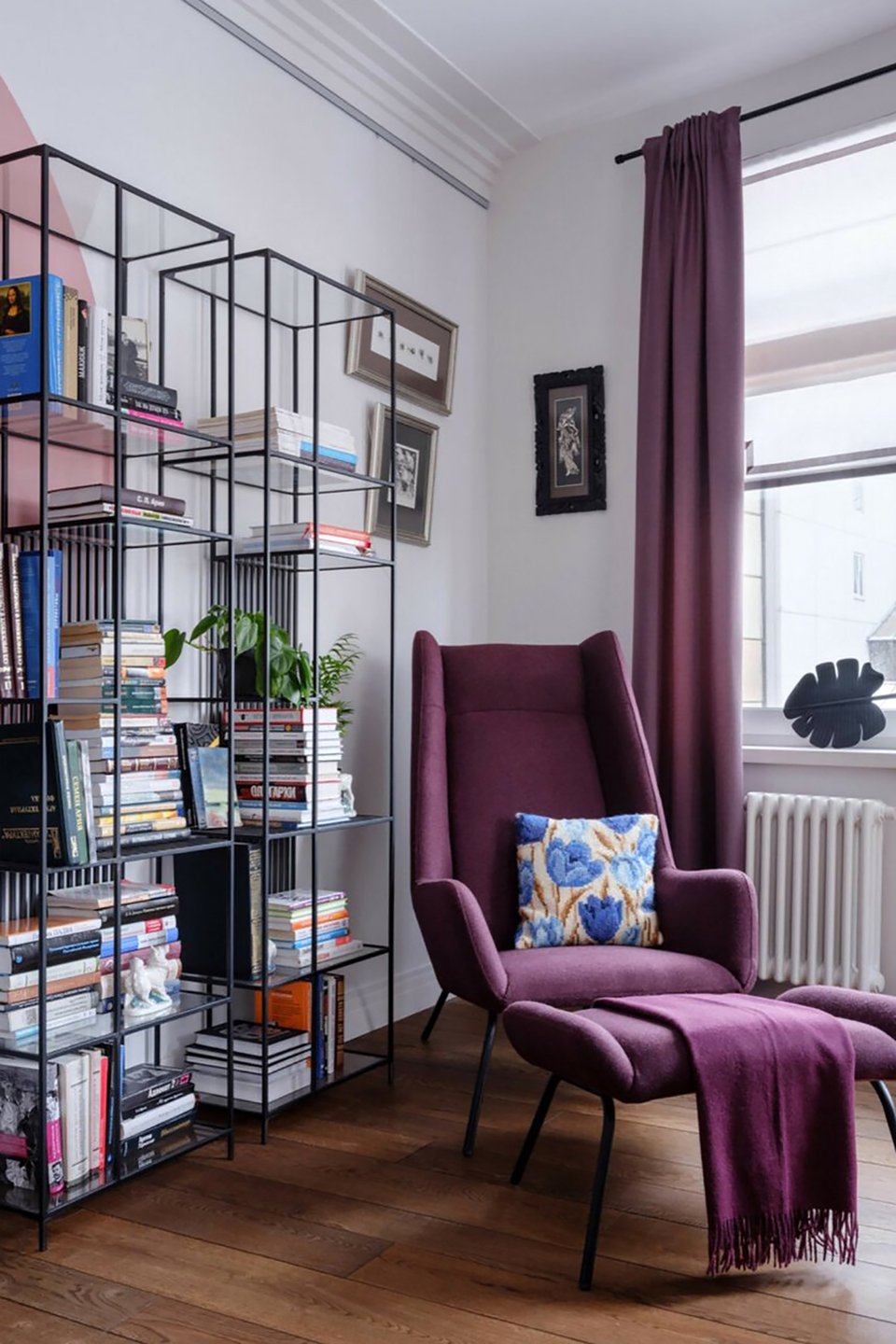 Если подоконник широкий, его легко превратить в уютную лежанку с мягкими подушками или рабочее место с красивым видом. Главное — защитить пространство от прямых солнечных лучей и помнить, что близость к радиаторам отопления может со временем навредить книгам.