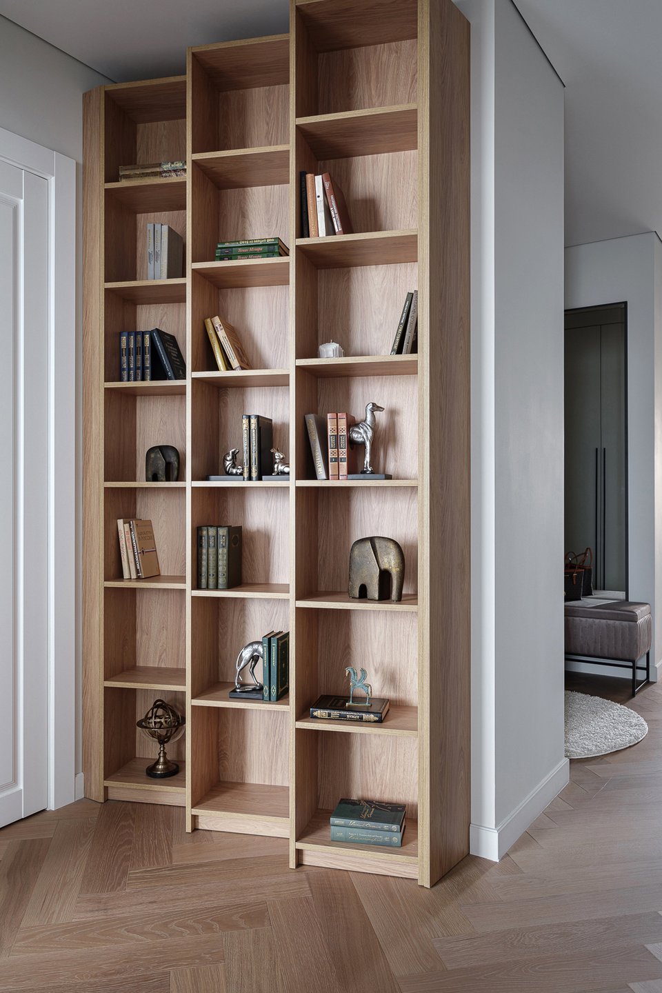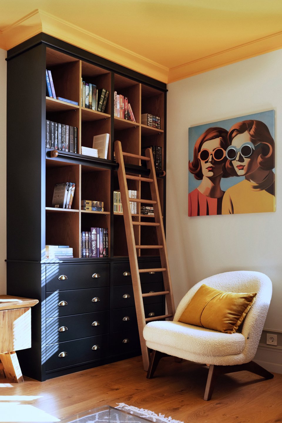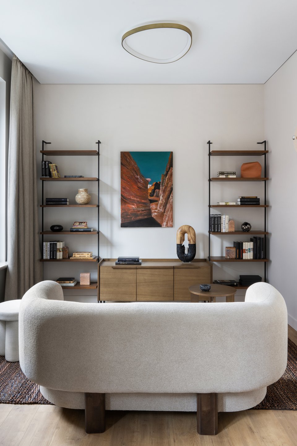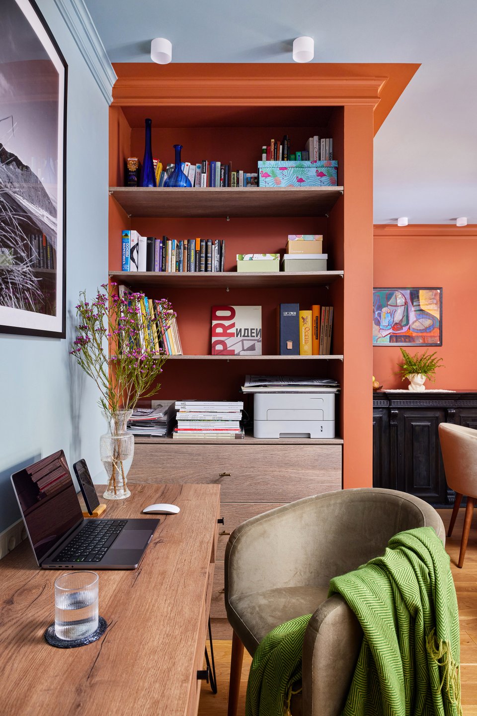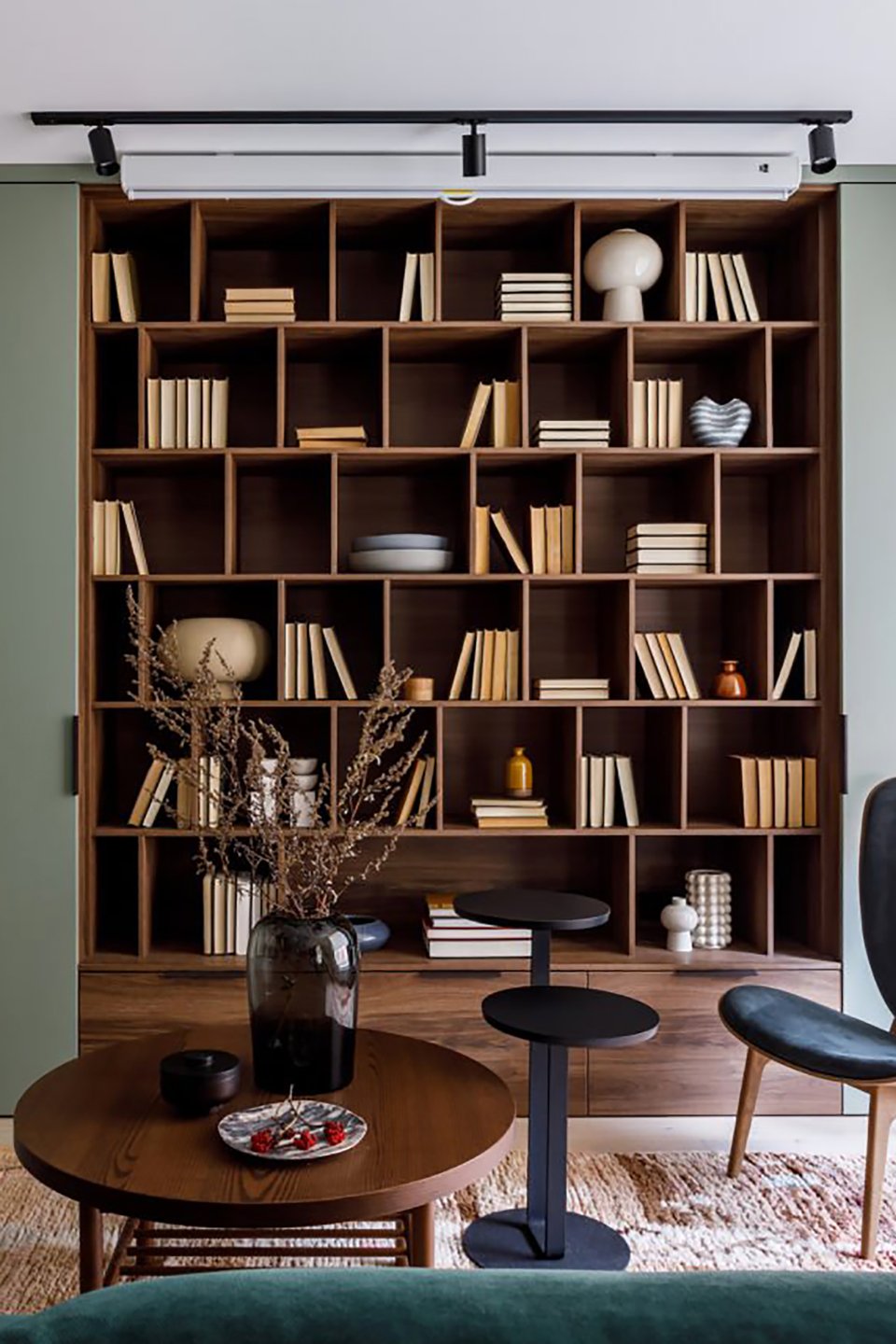 - Библиотека — мощный инструмент декора. Она не только отражает вашу индивидуальность, но и может быть главным акцентом комнаты. Сочетайте книги с декоративными предметами, играйте с расстановкой и цветом корешков, чтобы создать художественный образ, который легко поменять.