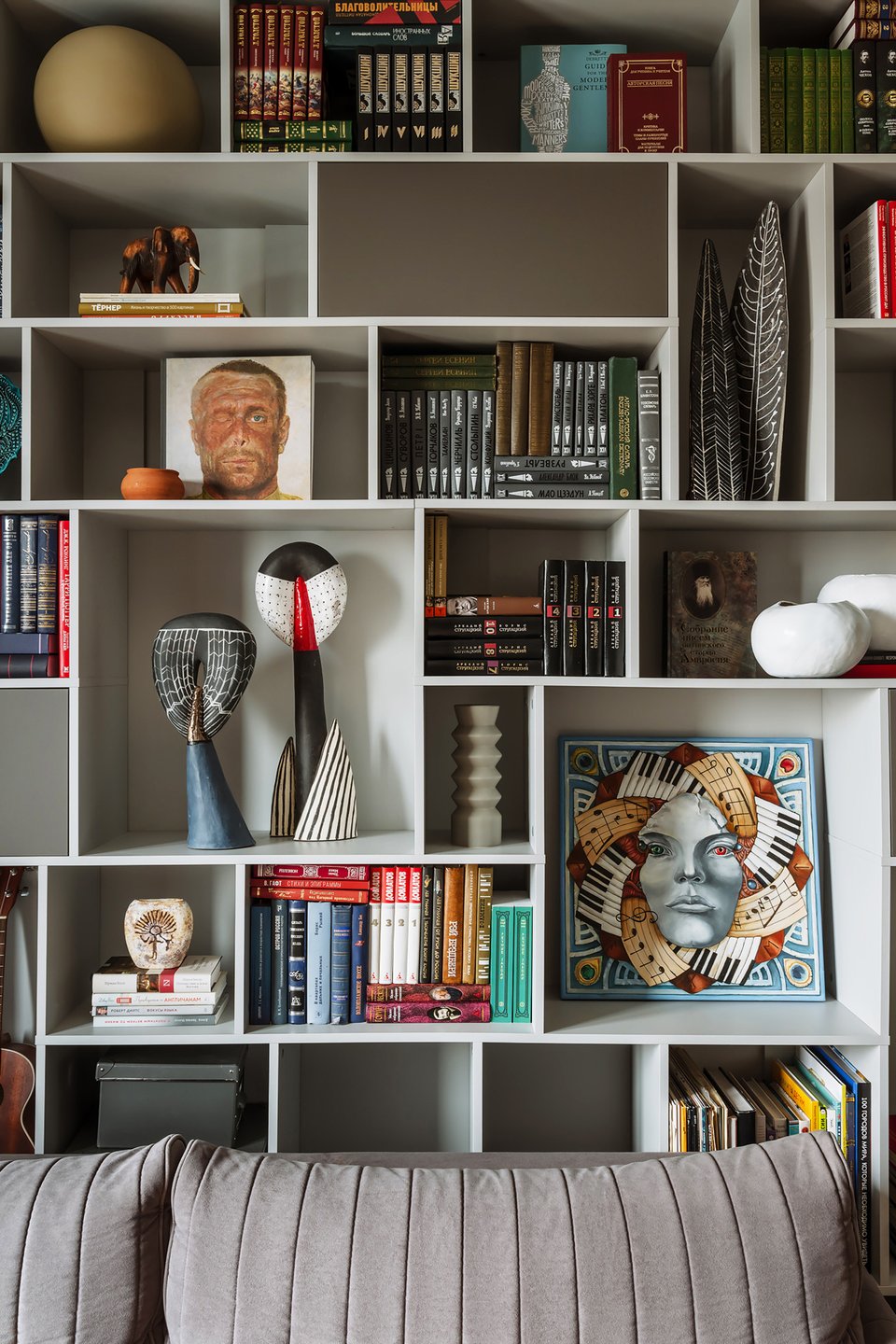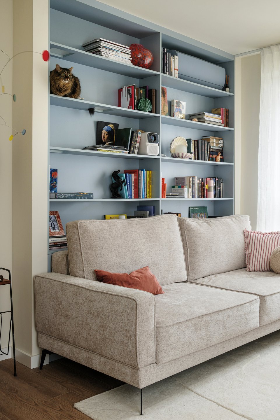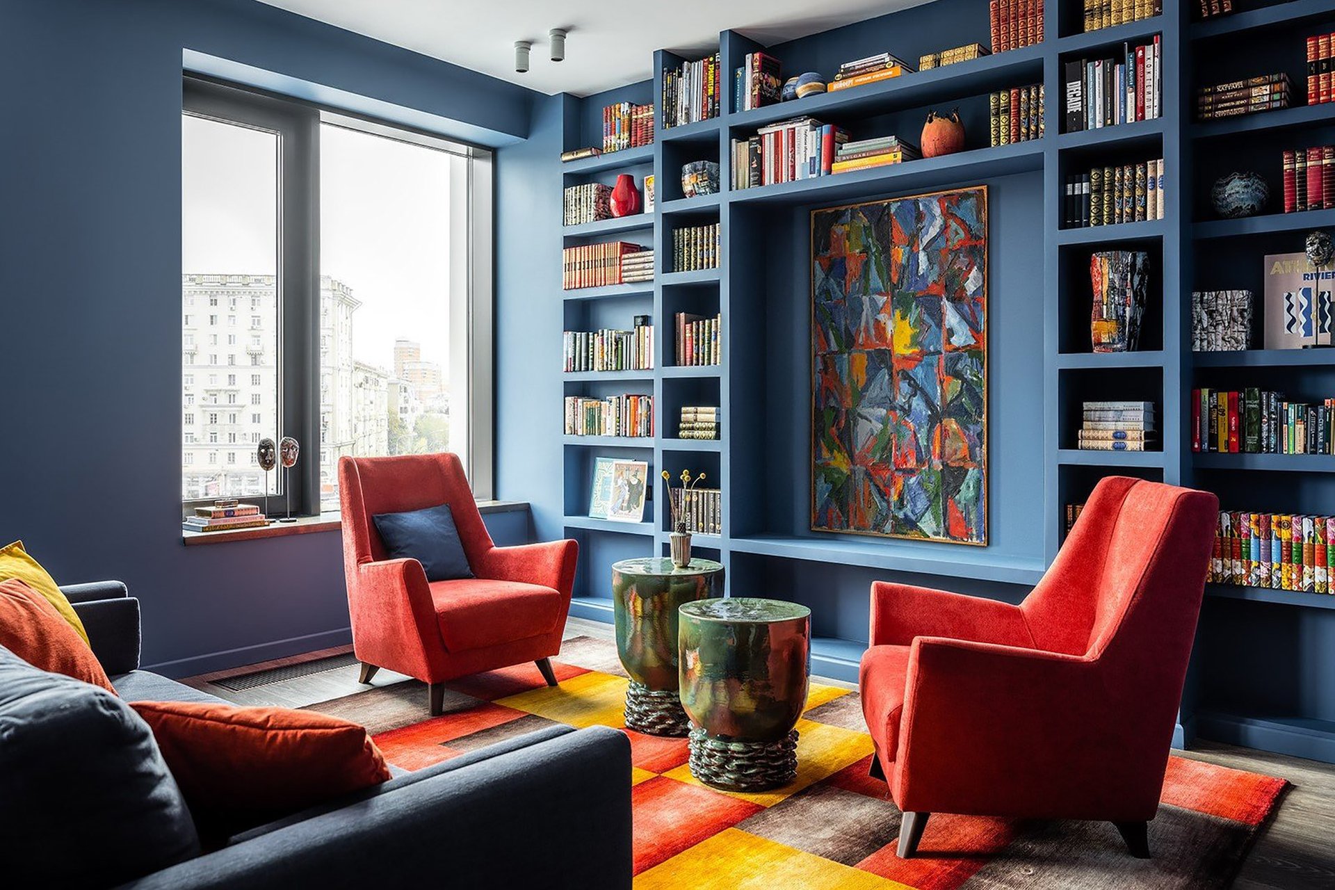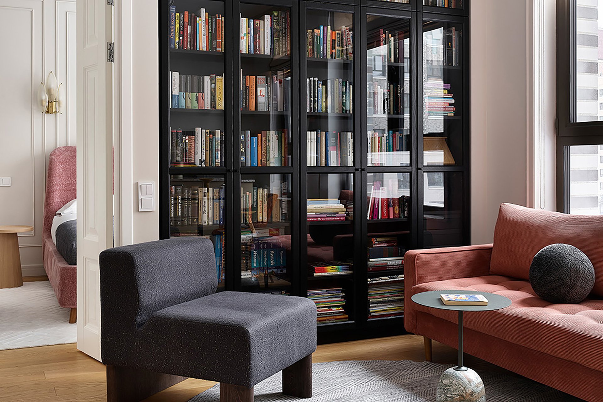 - Библиотека — мощный инструмент декора. Она не только отражает вашу индивидуальность, но и может быть главным акцентом комнаты. Сочетайте книги с декоративными предметами, играйте с расстановкой и цветом корешков, чтобы создать художественный образ, который легко поменять.