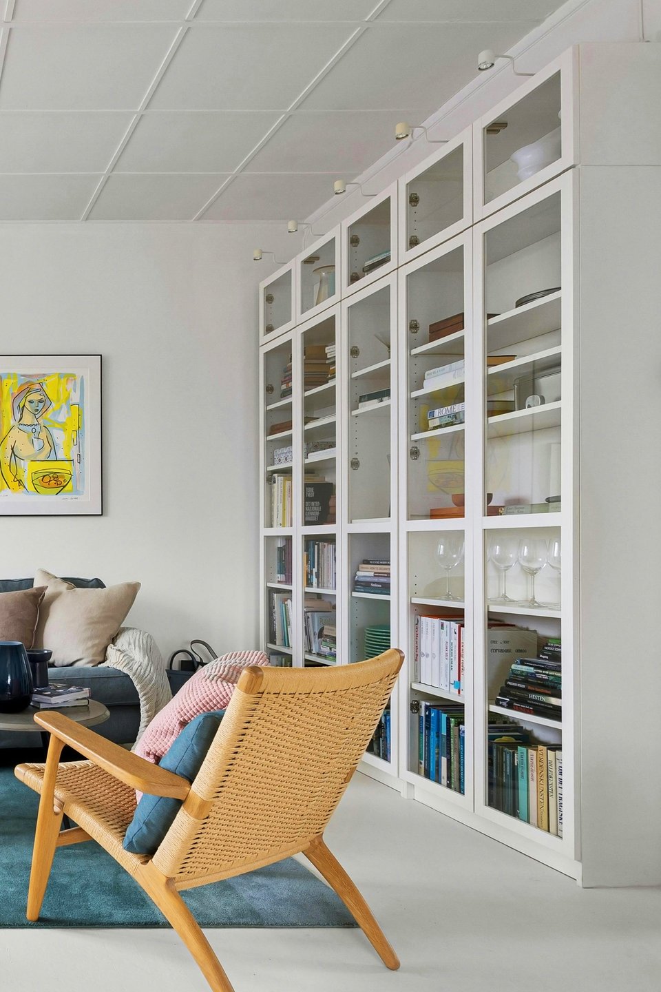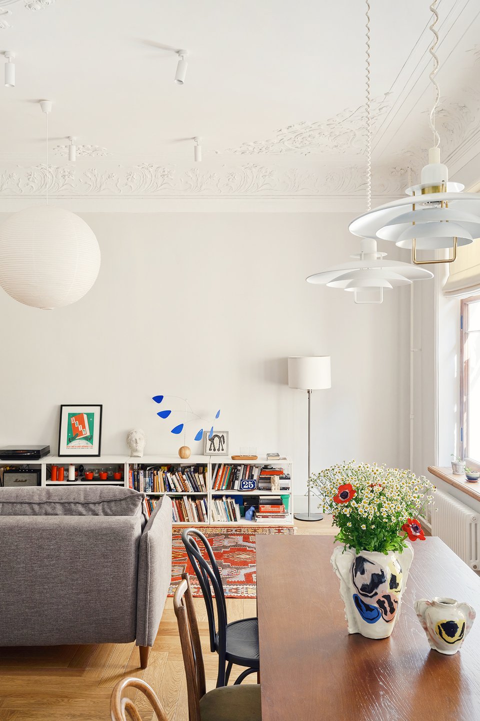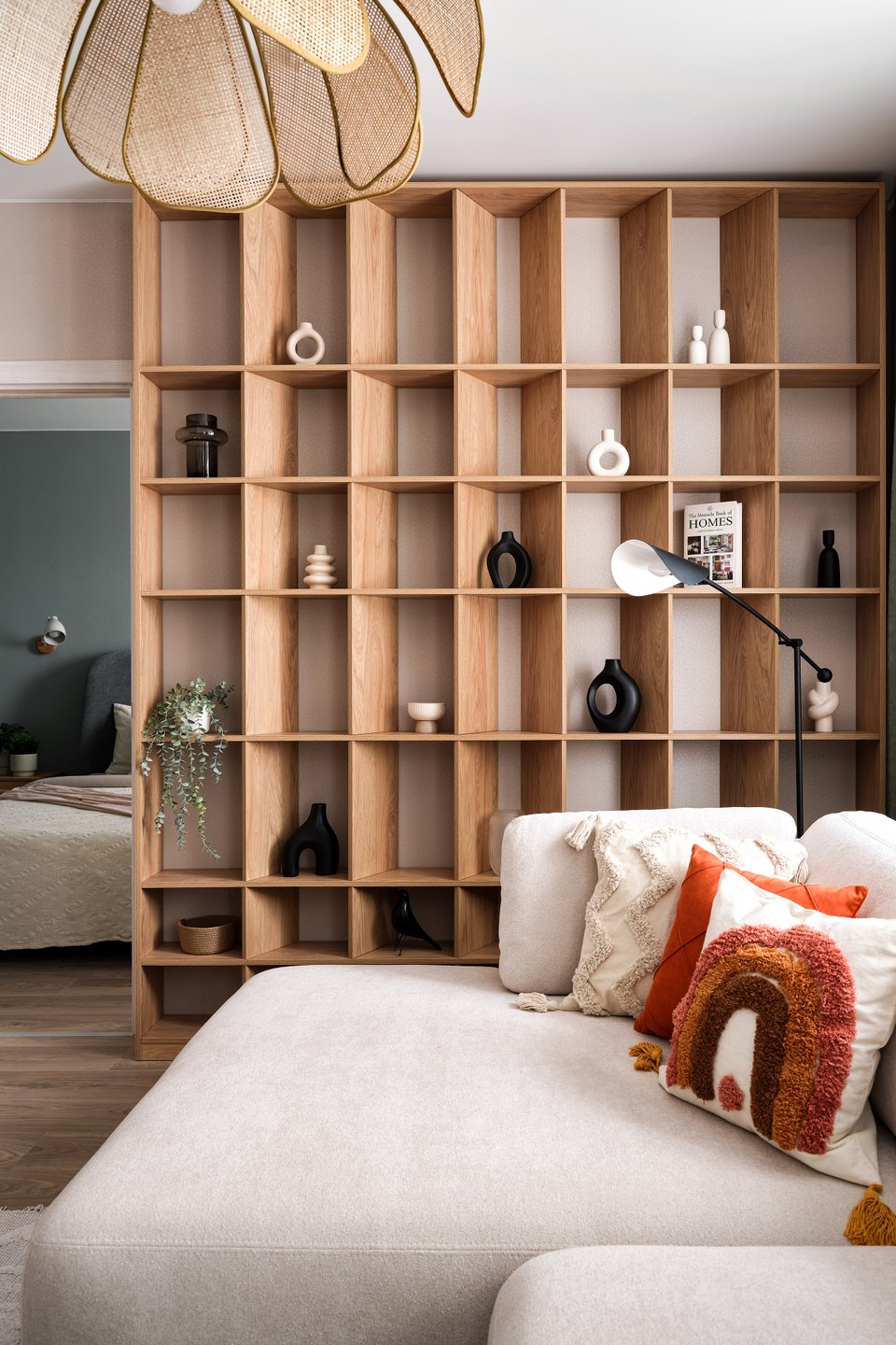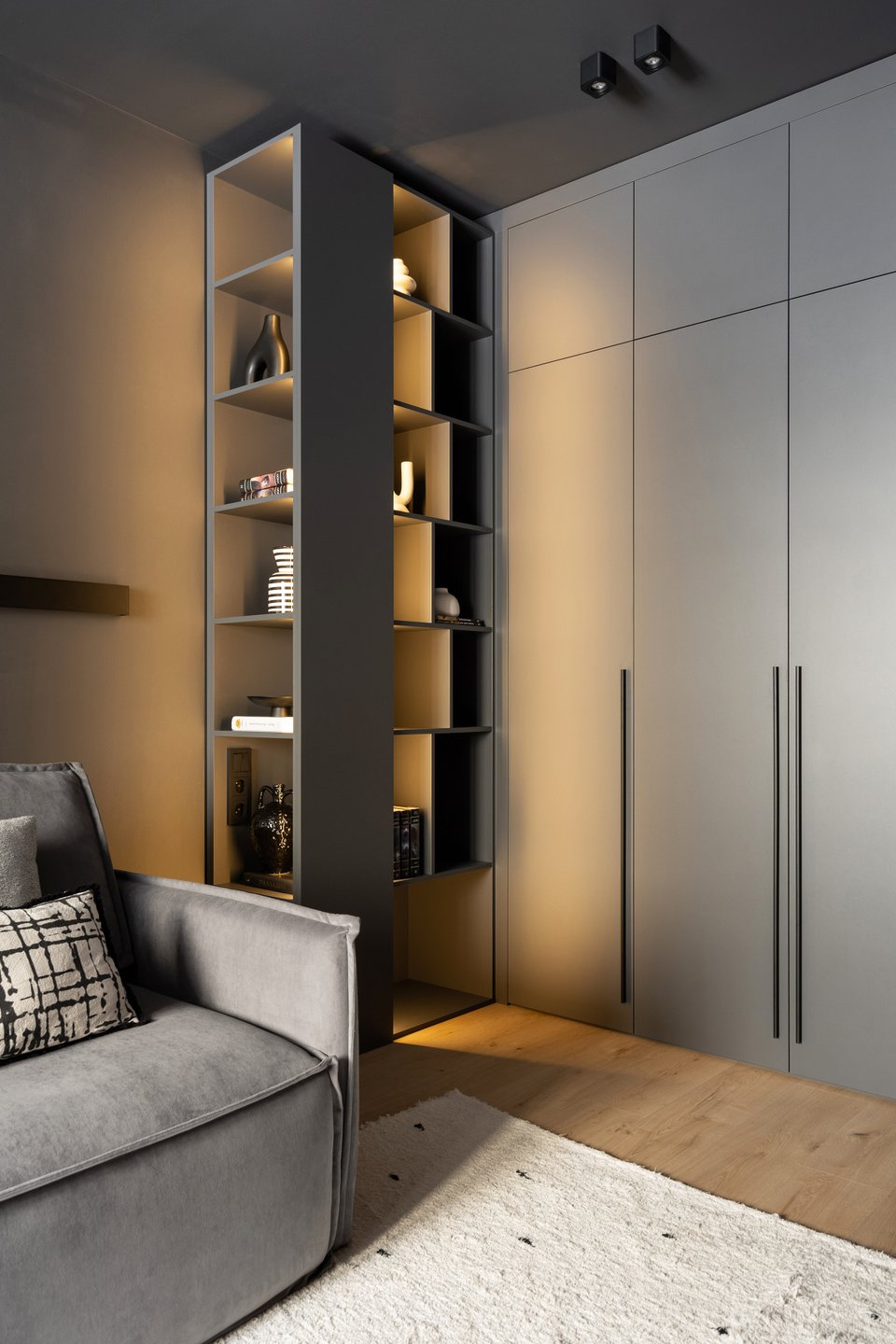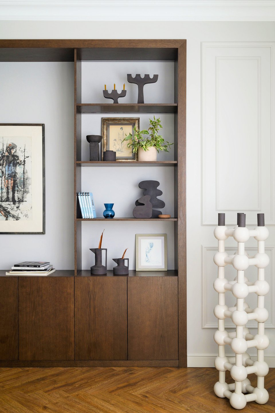 - Библиотека — мощный инструмент декора. Она не только отражает вашу индивидуальность, но и может быть главным акцентом комнаты. Сочетайте книги с декоративными предметами, играйте с расстановкой и цветом корешков, чтобы создать художественный образ, который легко поменять.