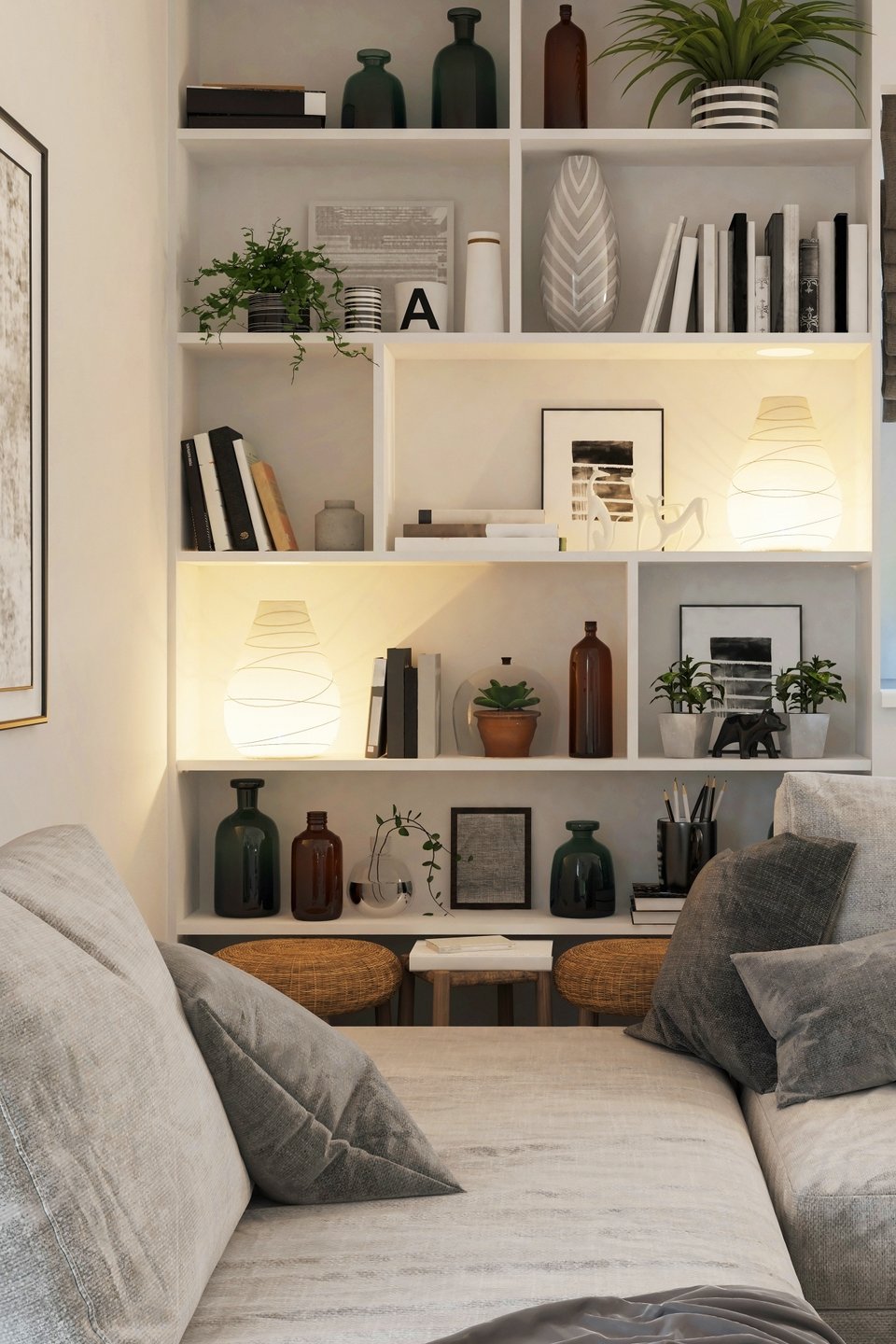 - Оставляйте свободное место на полках — это сделает композицию более легкой и художественной, подчеркивая красоту каждого отдельного предмета.