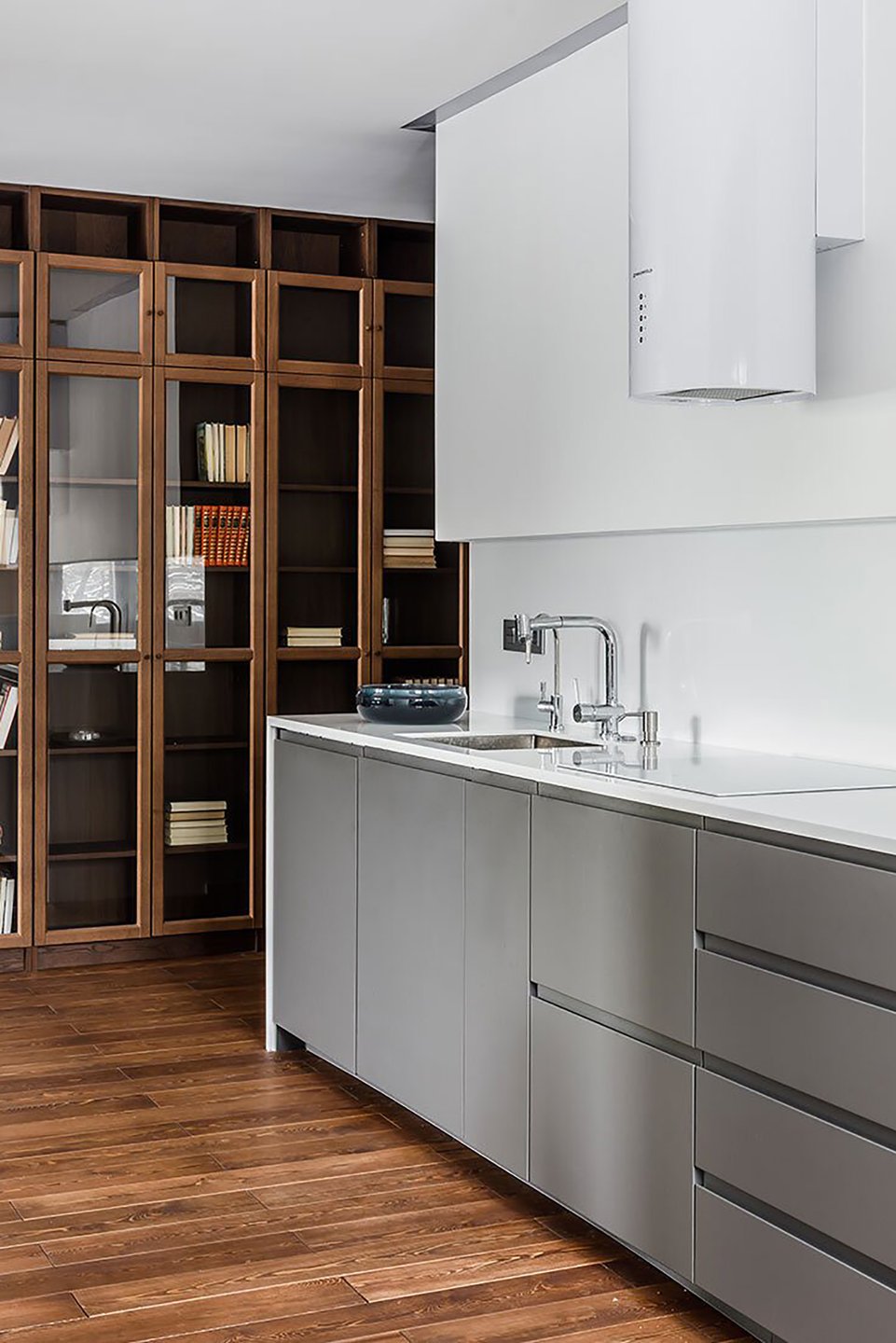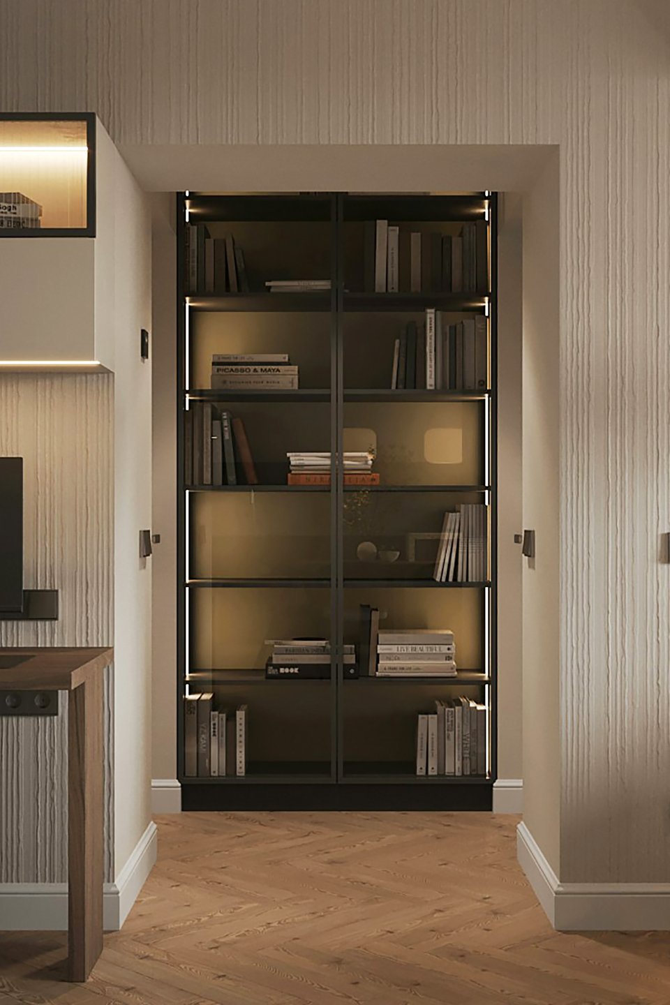 2. Закрытые системы. Шкафы с дверцами — это классическое решение, которое надежно оберегает вашу коллекцию от пыли, влаги и выцветания. Идеальный вариант для ценных и старых фолиантов или просто любимых томов, которыми вы не пользуетесь ежедневно. Особенно удобны стеклянные фасады: они позволяют видеть содержимое, сохраняя защитную функцию.