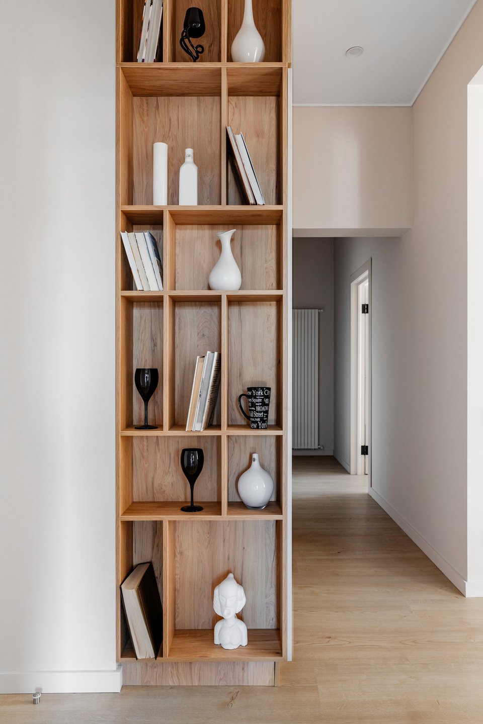 Это прекрасный шанс с умом использовать стены, которые обычно остаются незадействованными. Узкие высокие стеллажи или полки помогут визуально вытянуть пространство и не помешают удобному проходу. Если задействовать торцевые стены или пространство над дверными проемами, получится превратить транзитную зону в импровизированную галерею.