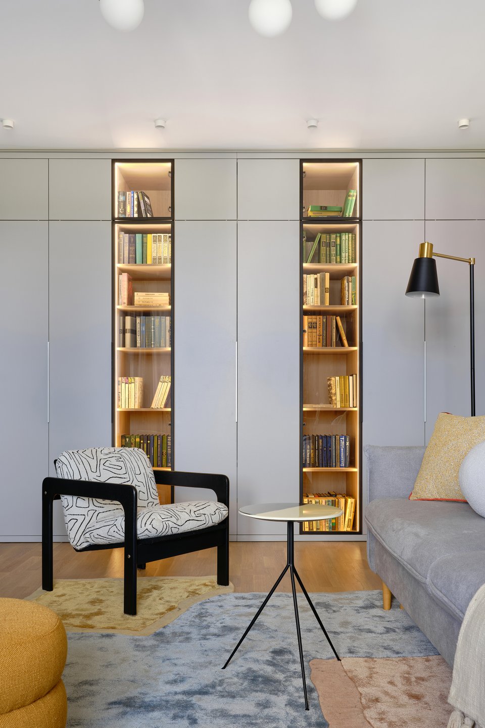 Лучший вариант — расположить светильники на разных уровнях. На потолке — общий рассеянный свет, например, встроенные споты; для чтения — направленные источники: торшеры, бра, настольные лампы; для декора — сделать подсветку полок светодиодными лентами.