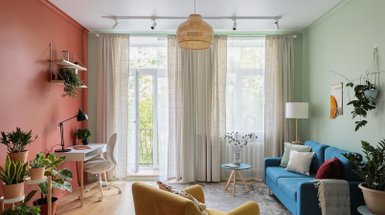 Любителям ярких красок лучше ограничиться одним диваном или холодильником насыщенного цвета. Добавить акцентов и сделать интерьер динамичнее можно с помощью декора и аксессуаров.