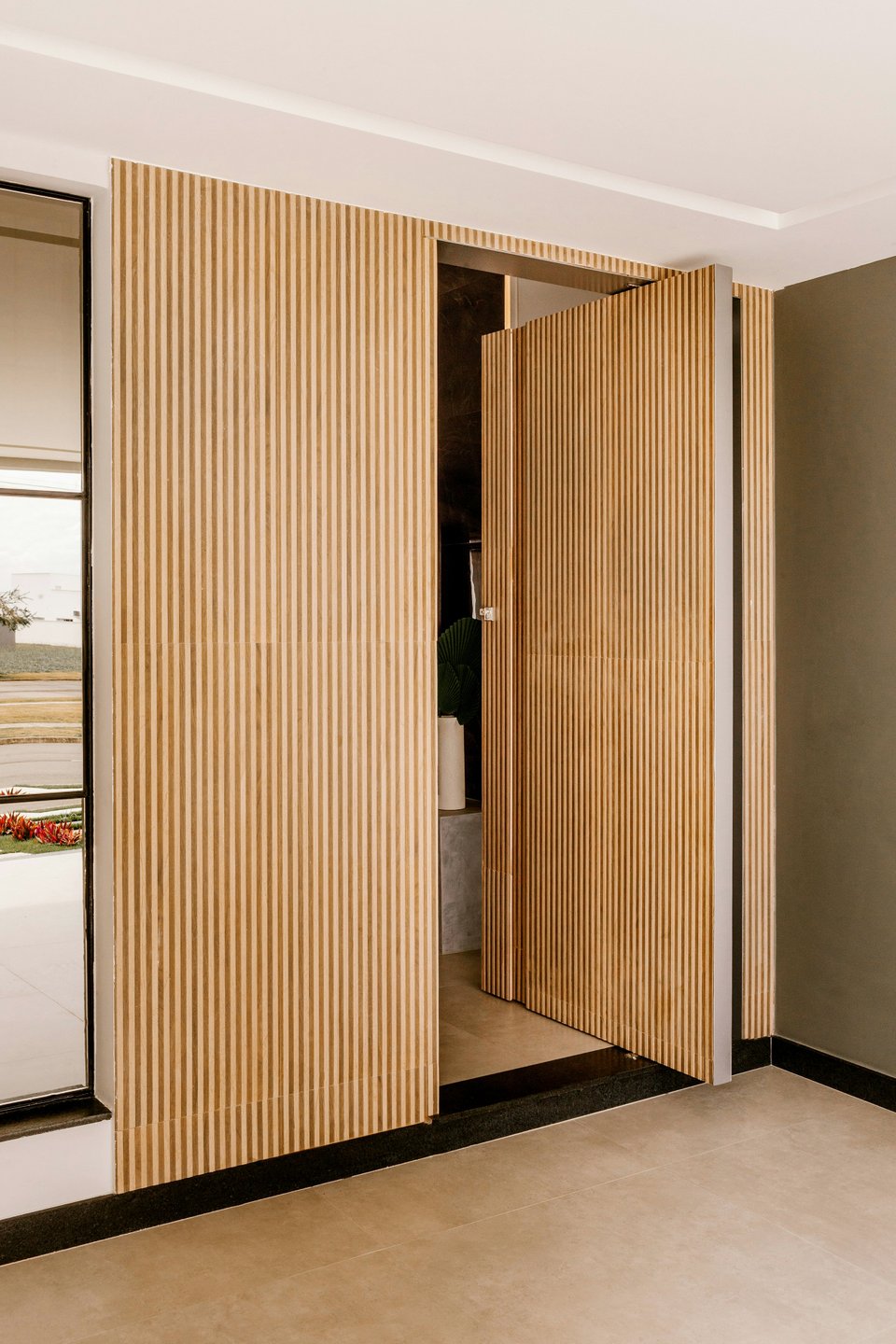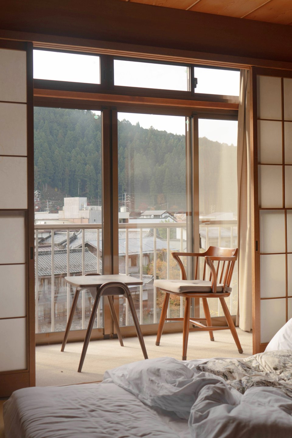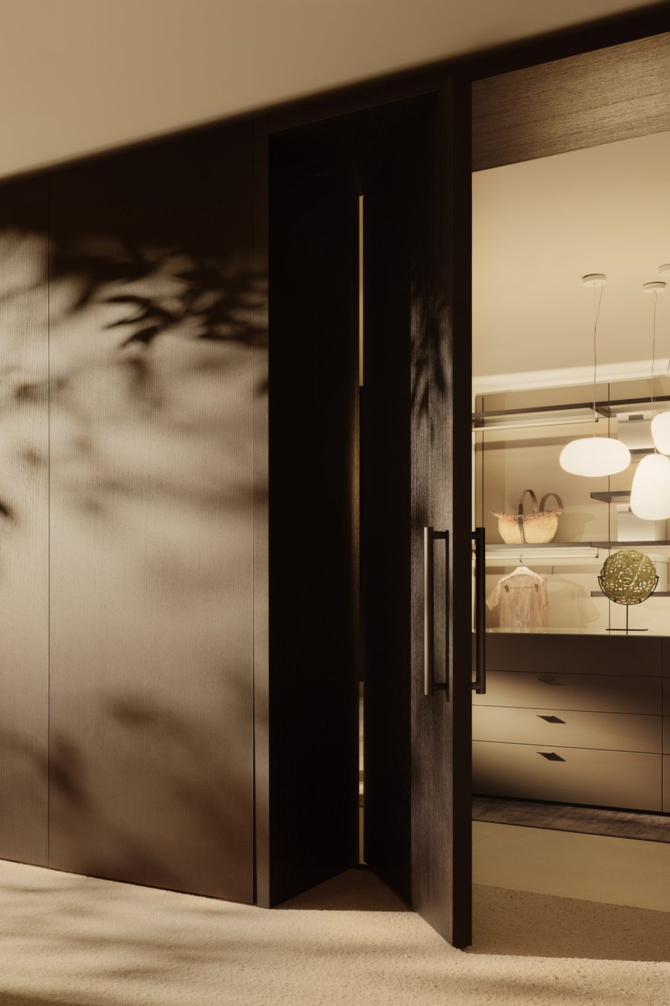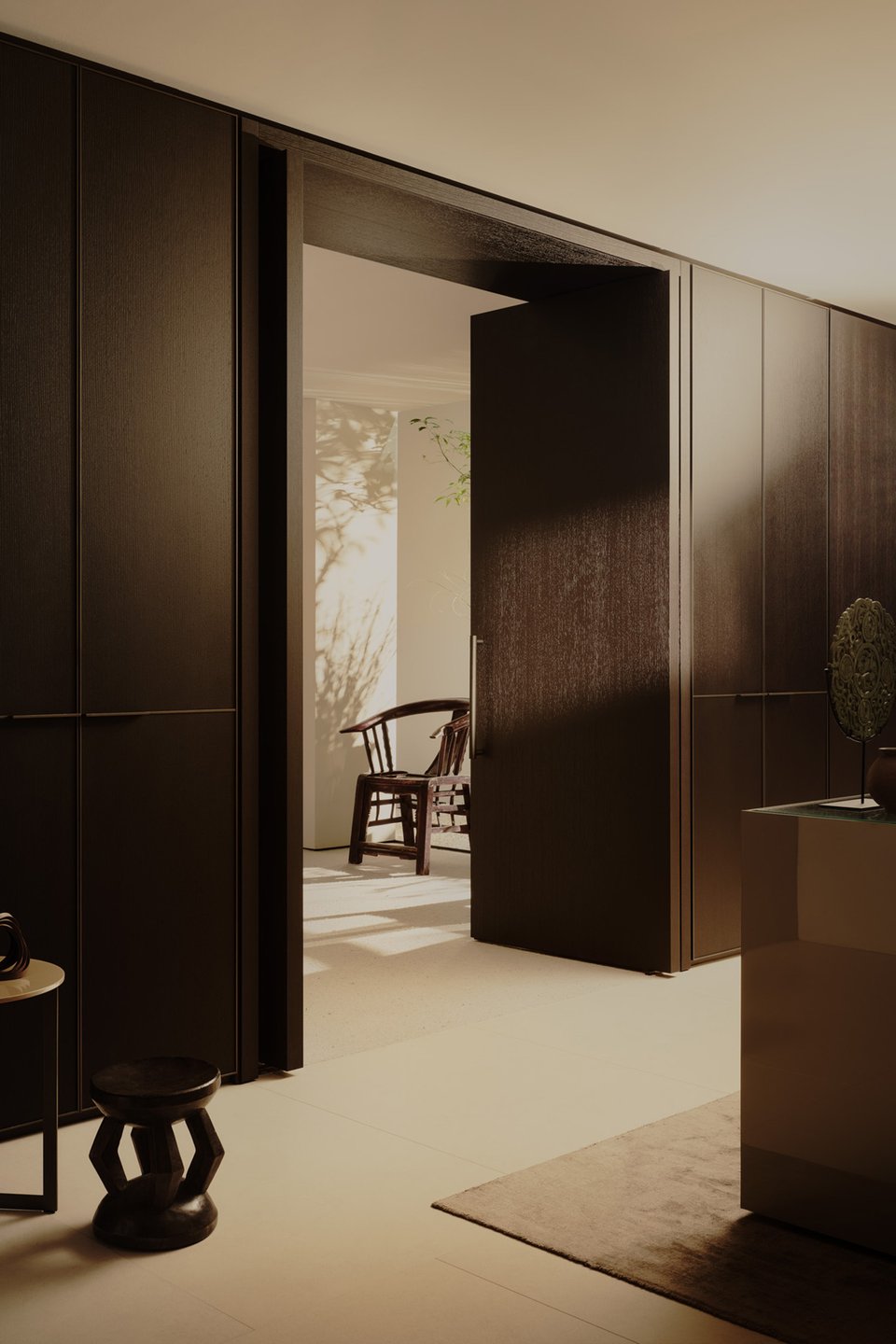 Классический вариант — это деревянная решетка, оклеенная рисовой бумагой. Они пропускают свет, но скрывают все, что спрятано за ними, делая размытым и таинственным. В современных реалиях вы можете использовать раздвижные системы с матовым стеклом или деревом. Такая конструкция отлично подойдет для отделения гардеробной зоны или ниши с кроватью.