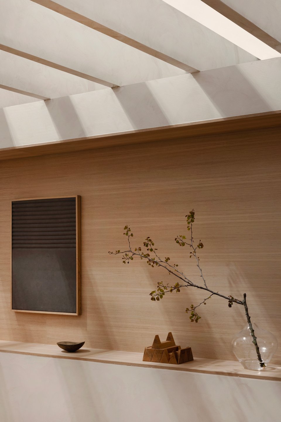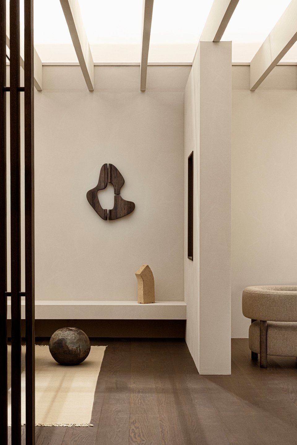 Интересный дизайнерский ход — потолочные балки. Темные деревянные, они контрастируют со светлым фоном, добавляют пространству визуального объема и создают ту самую графику и ритм, которые так ценятся в восточной эстетике.