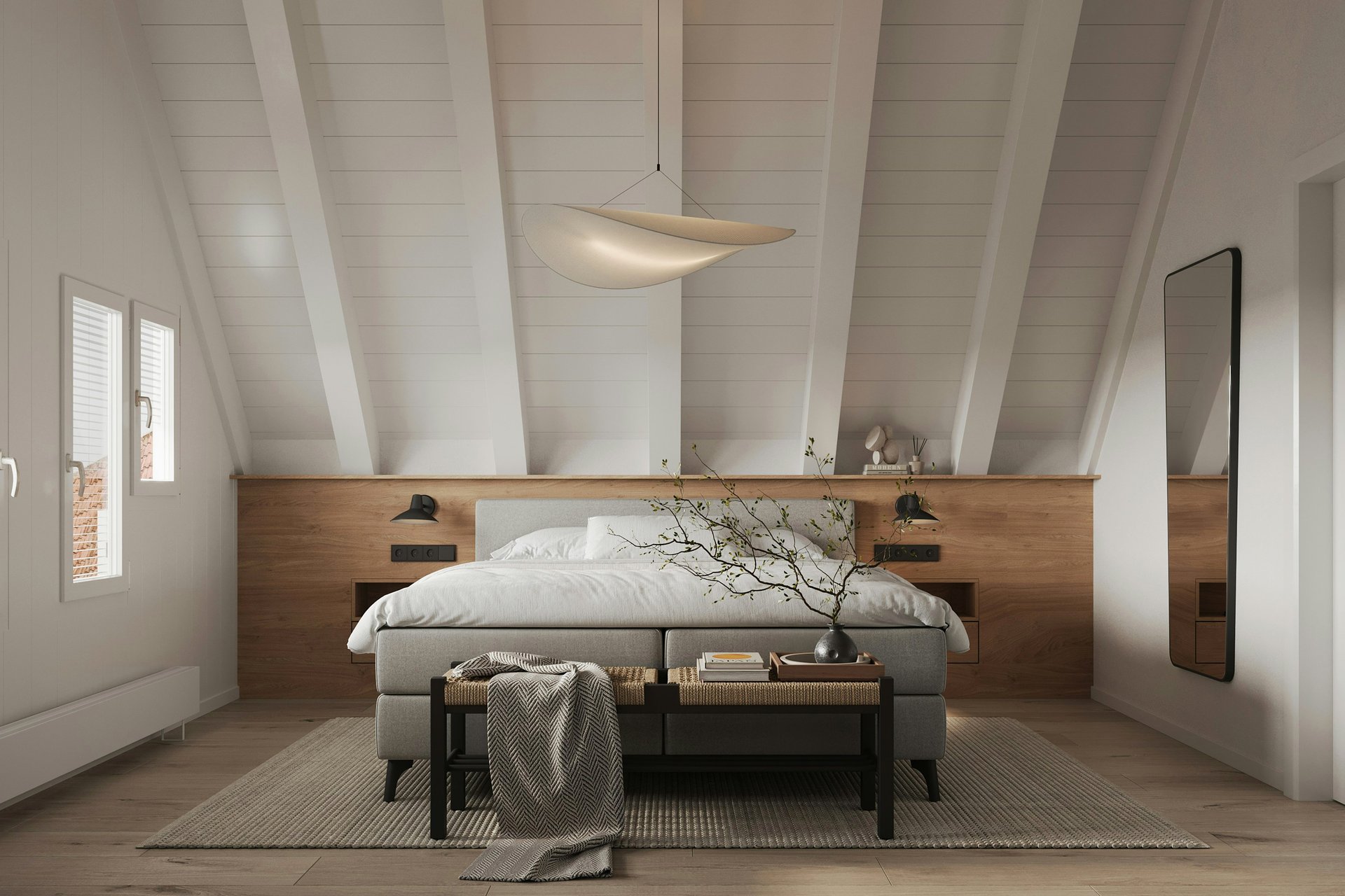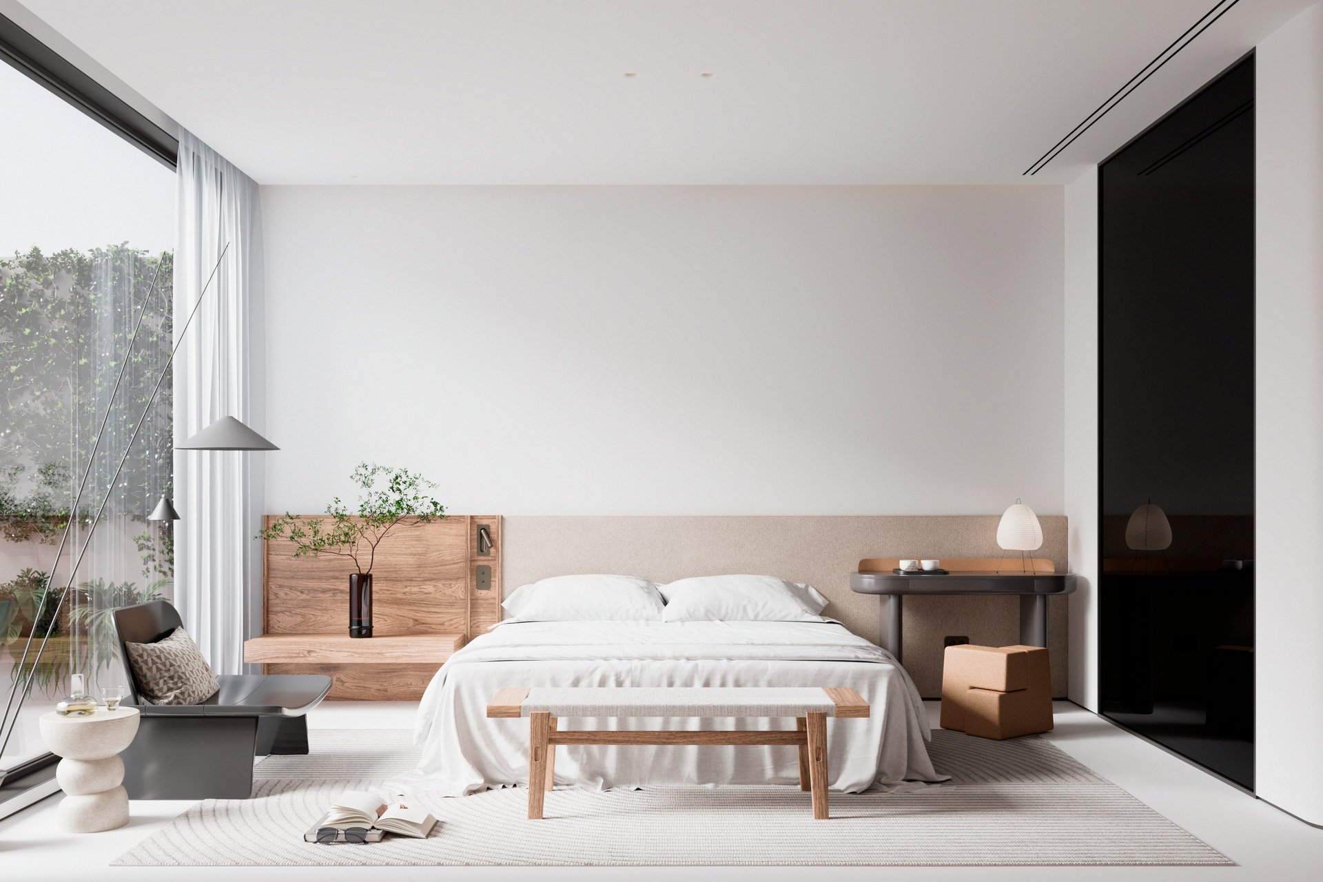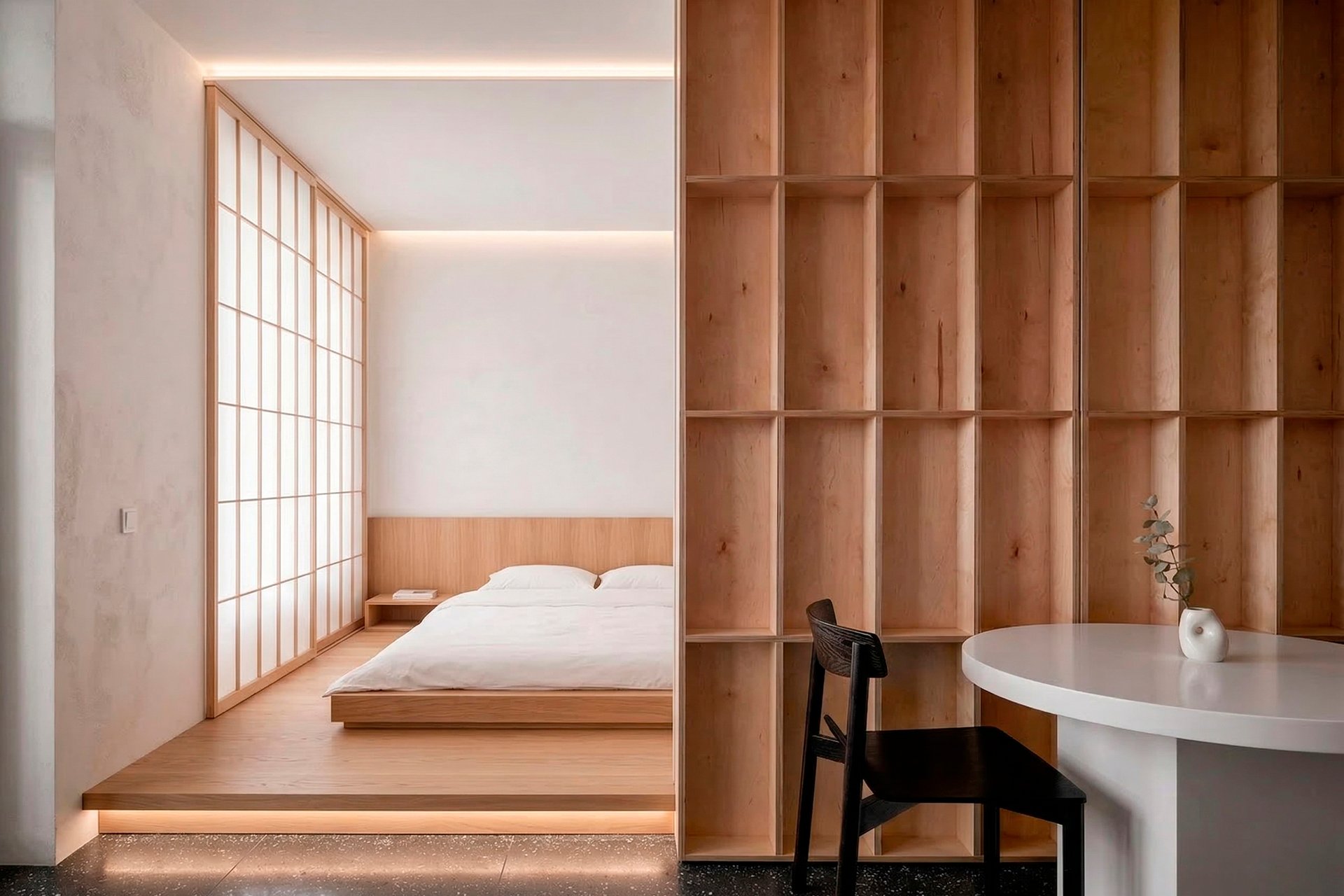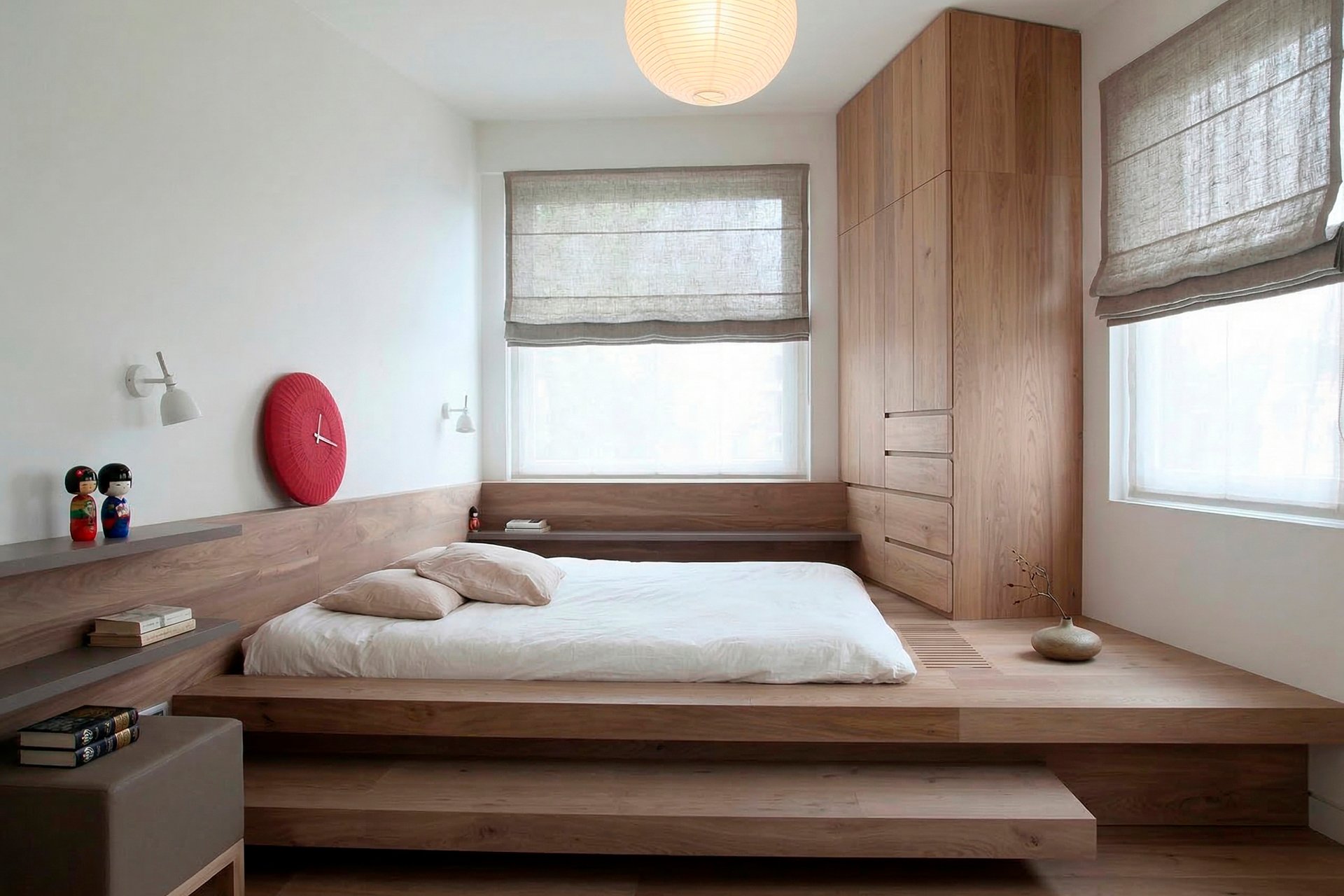 В основе всего лежит принцип «максимум функций при минимуме вещей». Здесь нет места стопкам книг на полу или валяющейся одежде. Каждый предмет мебели продуман до сантиметра и выполняет свою задачу. Для грамотно выстроенного пространства понадобятся скрытые системы хранения, встроенные шкафы-купе с фасадами без ручек. Японская спальня не терпит хаоса. Минимализм здесь — не аскетизм, а освобождение места для света и воздуха.