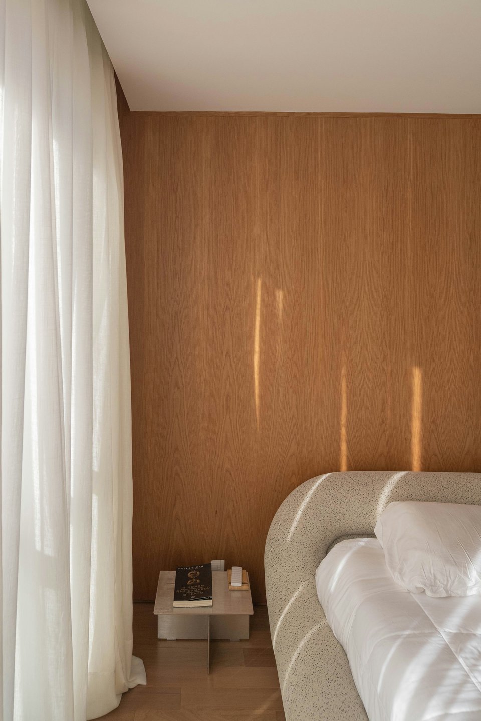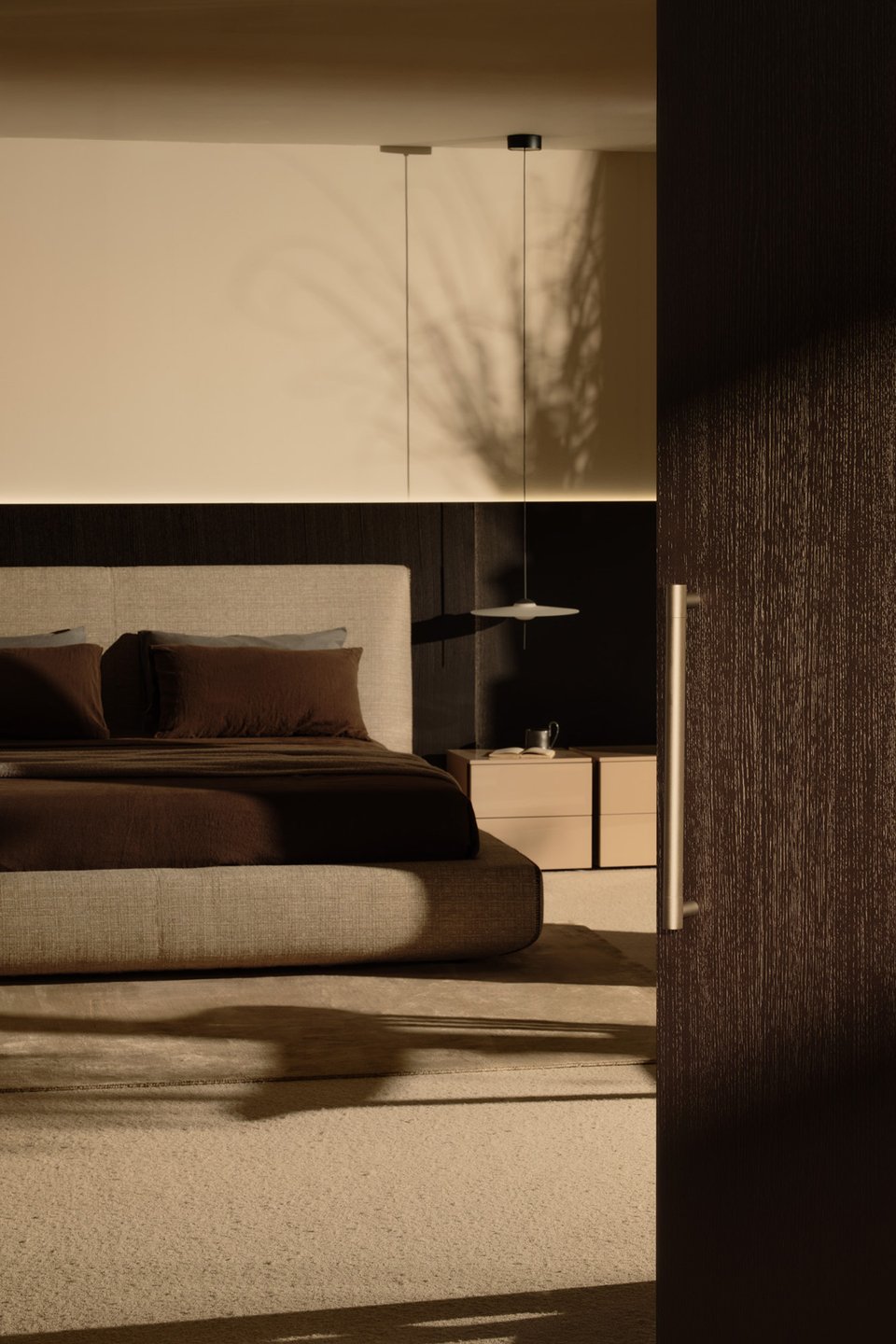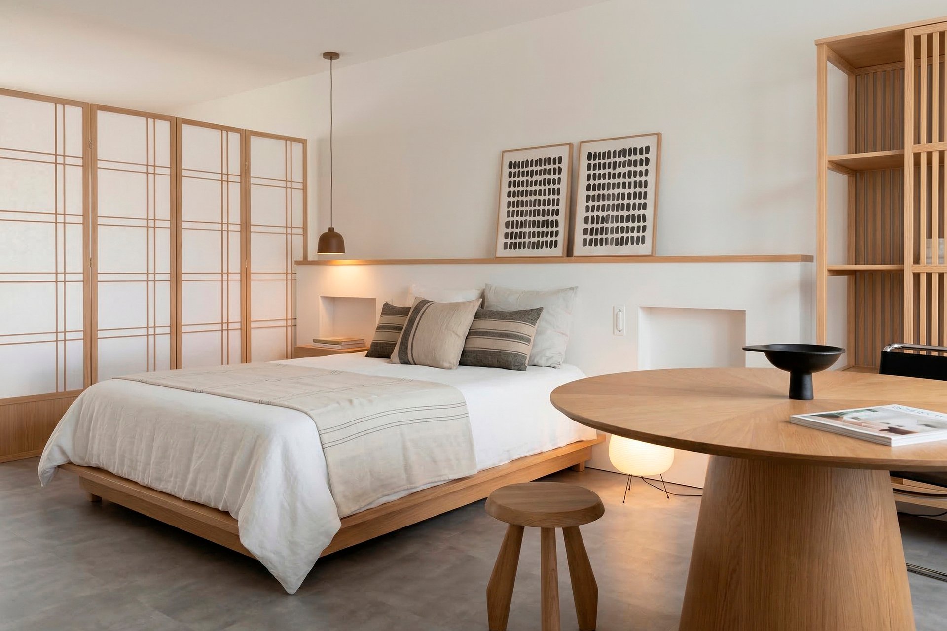 Если в западной традиции это обязательный атрибут, то здесь их роль могут выполнять легкие полки, встроенные в изголовье подиума, или просто небольшой столик на очень низких ножках. Вместо двух тумб может быть одна консоль, стоящая у изголовья. Главное — визуальная легкость и отсутствие массивности.