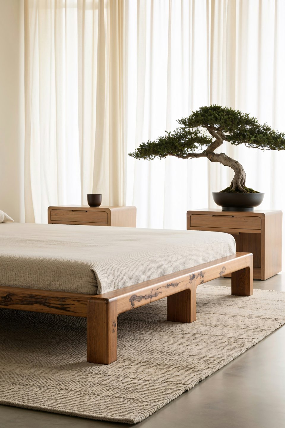 Глубочайший принцип, который часто упускают. Ваби-саби — это умение видеть красоту в несовершенстве, в естественном течении времени. В интерьере спальни в японском стиле это проявляется в выборе материалов с живой текстурой: грубоватая керамика, дерево с сучками и неровной поверхностью, лен, который мнется, но от этого выглядит только благороднее.