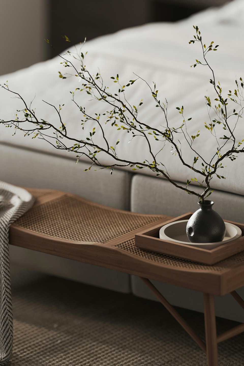 Текстиль лучше выбирать только из натуральных тканей: лен, хлопок. Постельное белье подойдет белое, серое, бежевое, без рисунка. Принты могут быть только графичными, скажем, ветка сакуры, но очень дозированно. В джапанди, где добавляется скандинавский стиль, можно использовать абстрактные узоры.