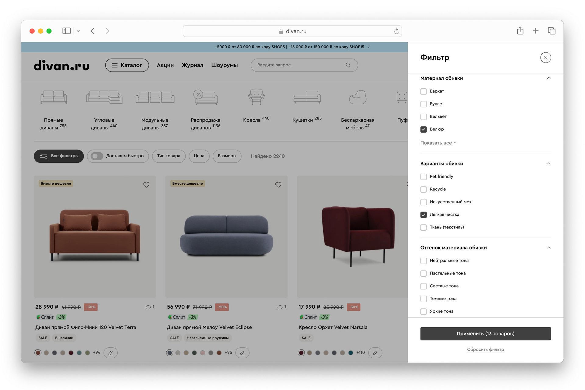 С помощью фильтра на сайте divan.ru легко найти модели в обивке с пропиткой Easy Clean