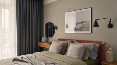 Заметную роль в спальне играют прикроватные тумбы. Размещение декора на них обеспечивает особый визуальный эффект. Чаще всего тумбы украшают красивыми лампами, парой книг, небольшими свечами или часами. Но существуют варианты поинтереснее — крупная ваза с живыми цветами или необычная скульптура создают асимметричную композицию из декоративных элементов и предметов утилитарного назначения.