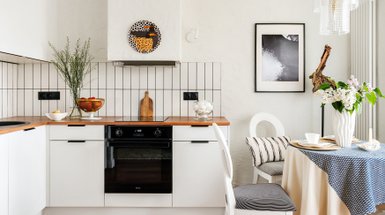 Владелица этой квартиры попросила дизайнера превратить кухню в кухню-гостиную, поставив здесь полноценный раскладной диван. Места для гарнитура при этом практически не осталось.