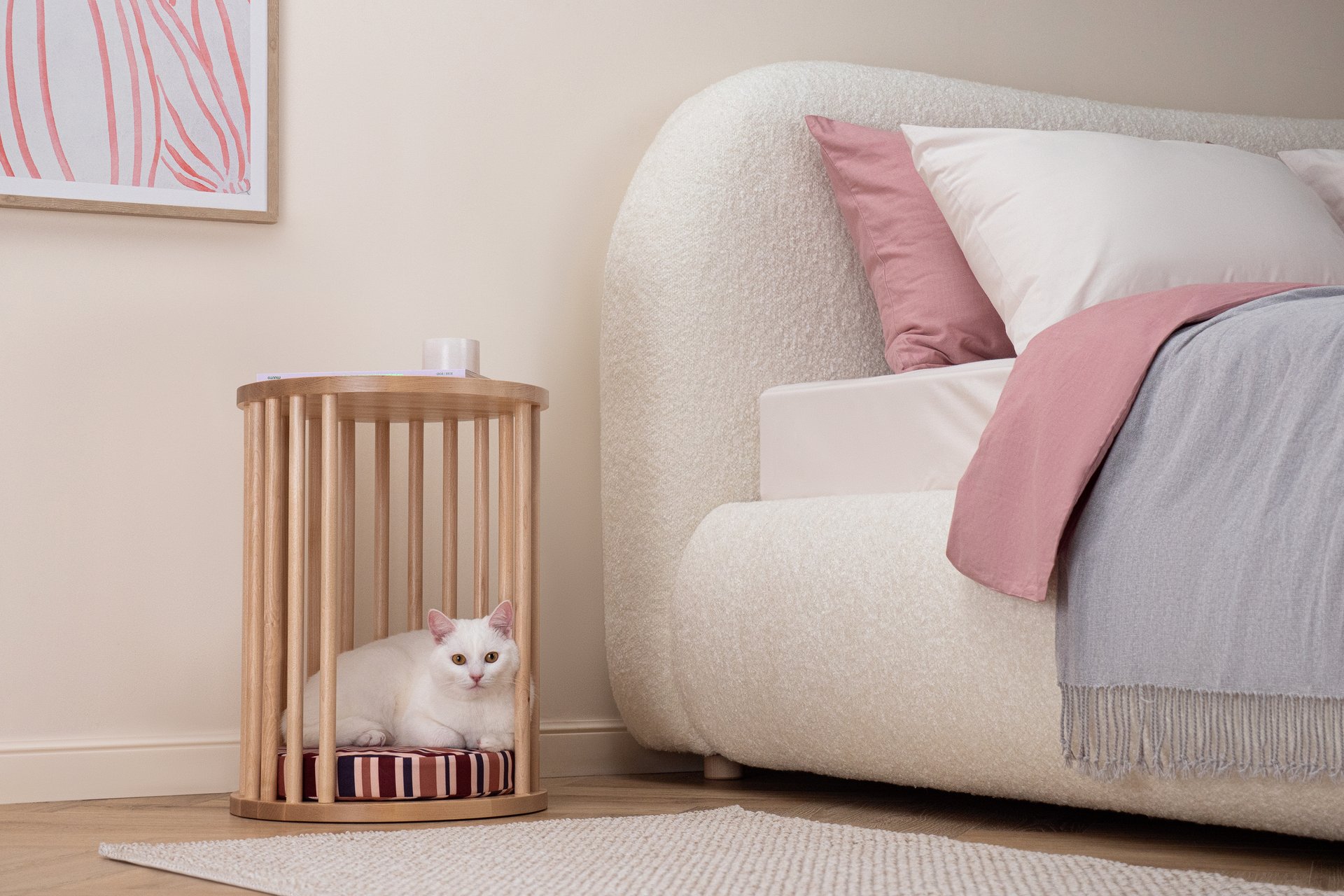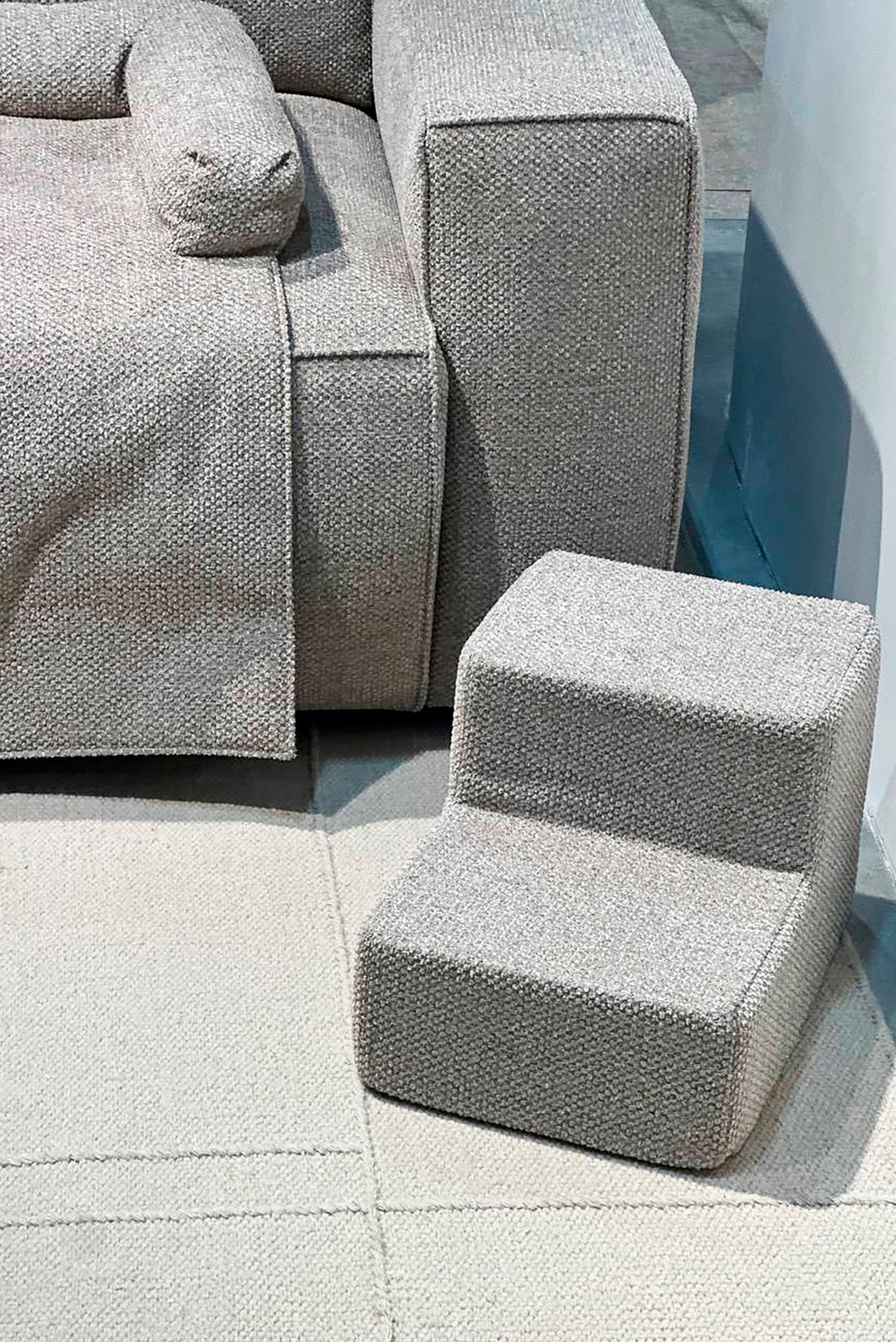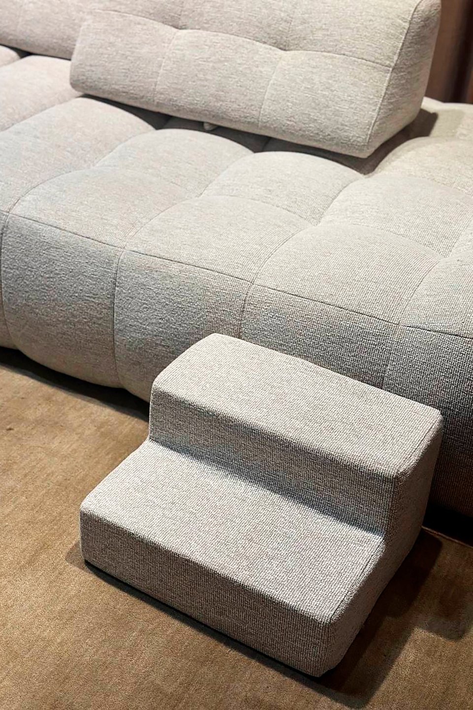 Еще одна важная деталь — интеграция в основную мебель. Например, ступеньки, которые помогают питомцу забраться на кровать или диван, больше не выглядят как отдельный элемент. Они повторяют форму и обивку мебели, становятся ее продолжением и визуально «растворяются» в интерьере.