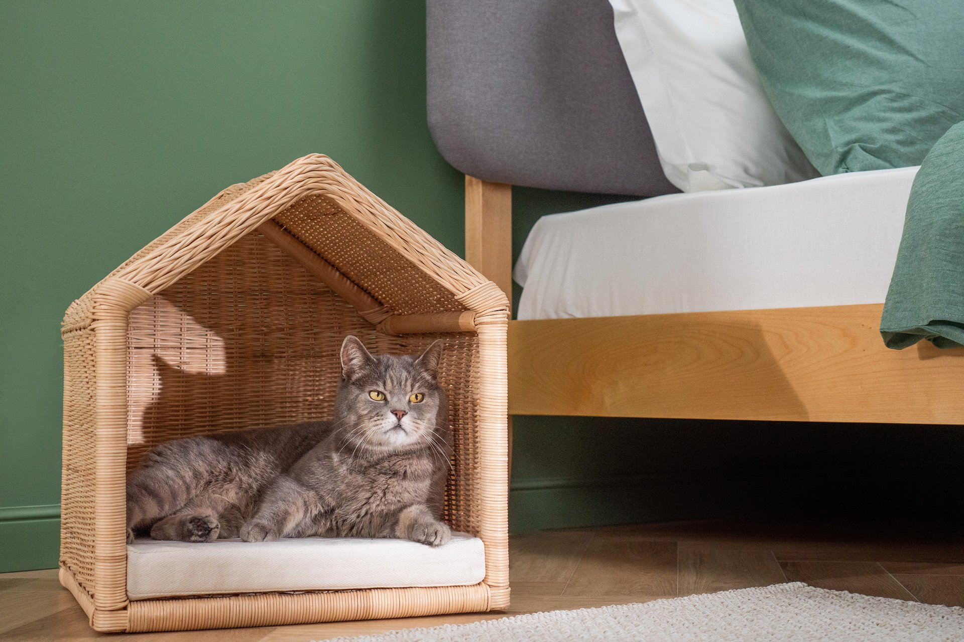Домики повторяют формы мебели, лежанки поддерживают цветовую палитру интерьера, а материалы подбираются так же внимательно, как и для диванов или кресел. В результате предметы для животных не выбиваются из общей композиции, а дополняют ее.