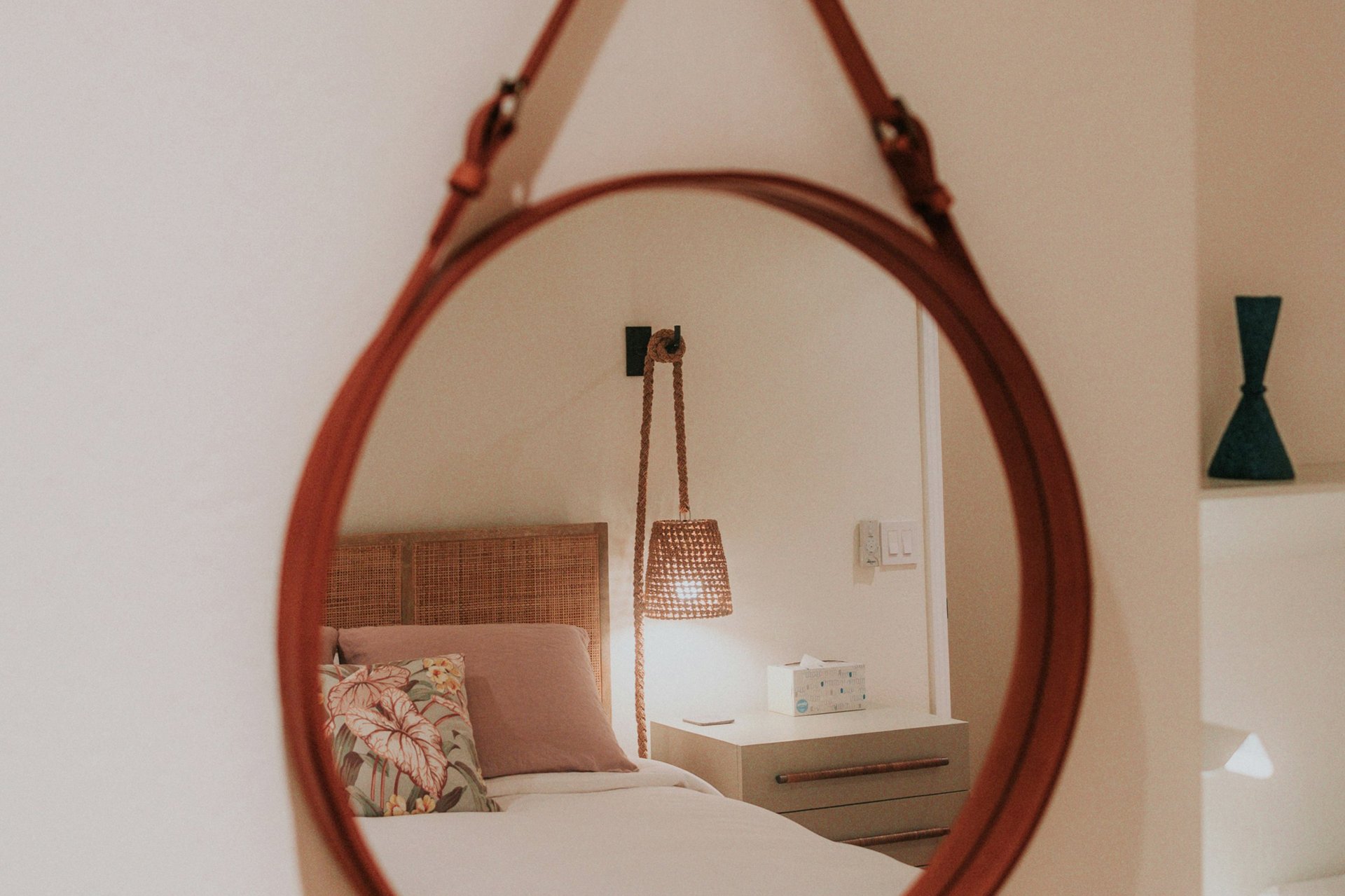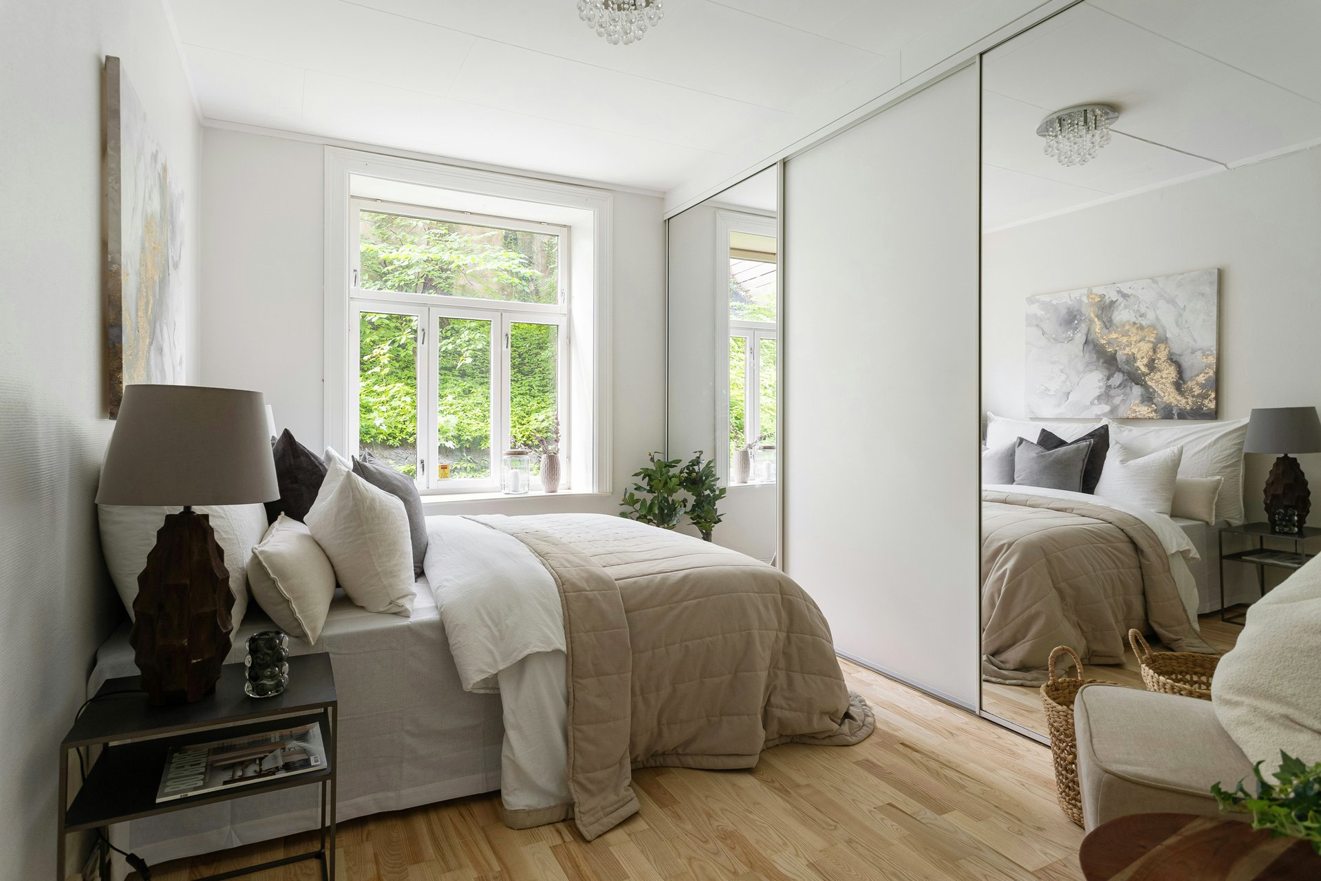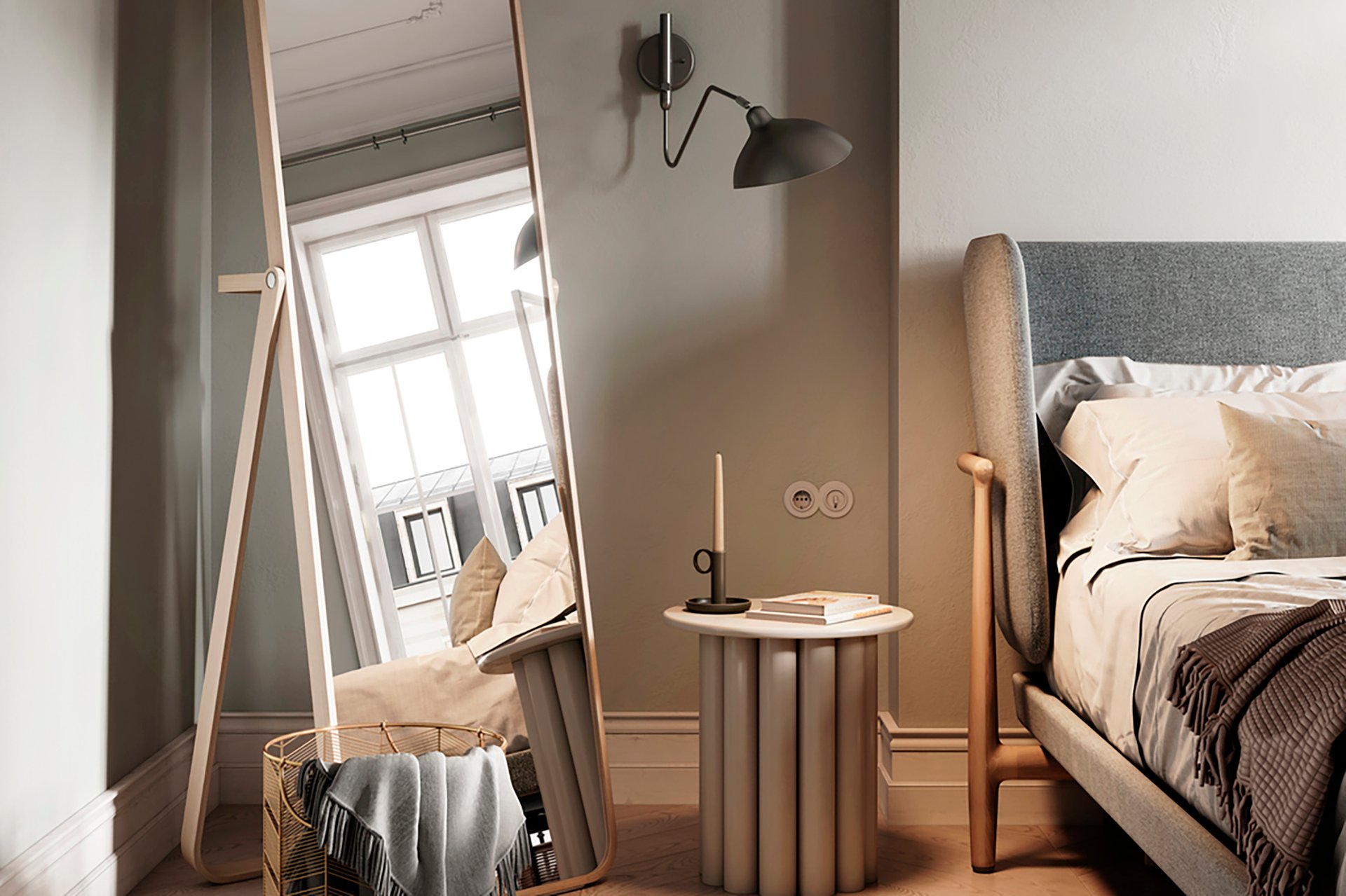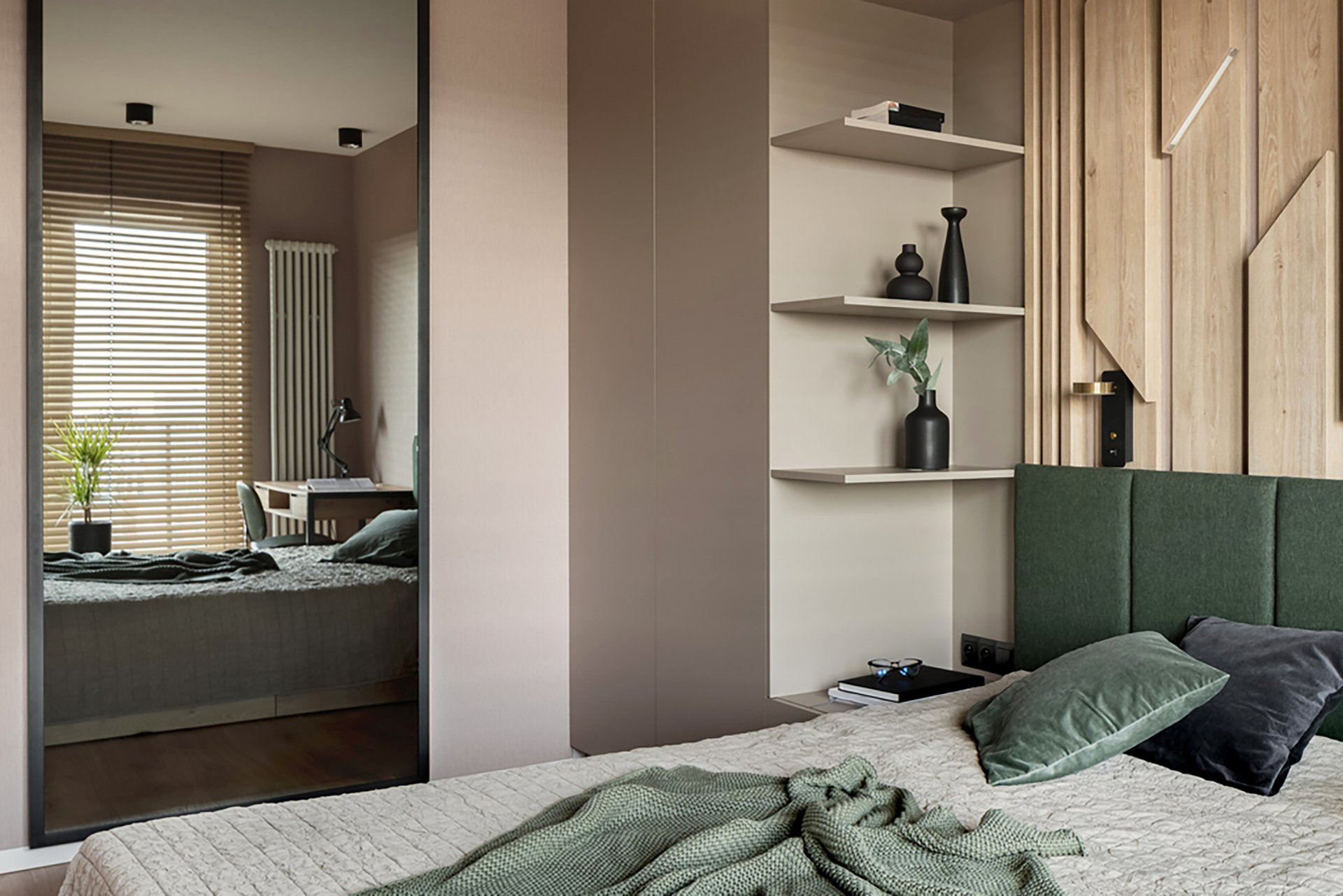 Идеальный вариант — расположить зеркало так, чтобы оно усиливало ощущение простора и света. Например, сбоку от кровати или на внутренней стене, которая не видна сразу при входе в комнату. Важно, чтобы в нем отражались спокойные, «мягкие» объекты: нейтральные стены, красивые шторы, приятный декор.