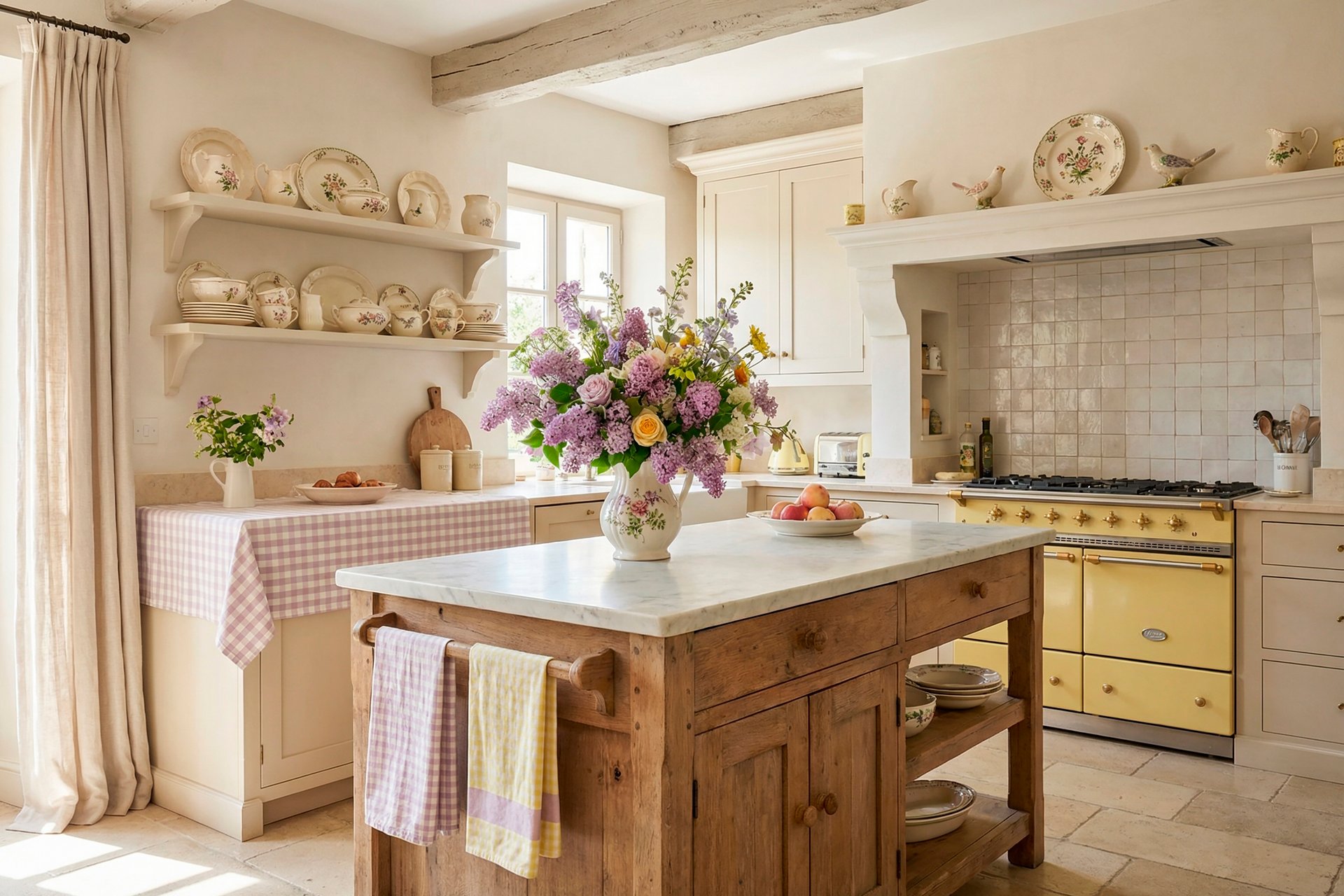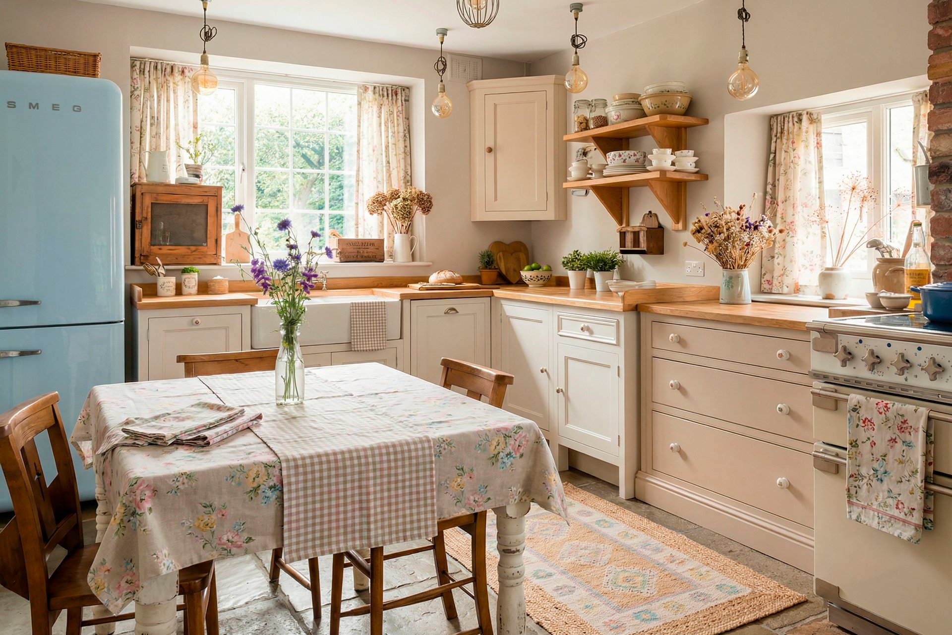 Это максимум «домашнего» и минимум экспериментов. Спокойные бежевые, кремовые, пастельные оттенки, филенчатые фасады, керамические ручки, текстиль с мелким цветочным рисунком или клеткой. Здесь много дерева, фарфора, льна, никаких резких контрастов и индустриальных деталей. Такой вариант ближе всего к образу «кухни у бабушки», но в более аккуратном, современном прочтении.