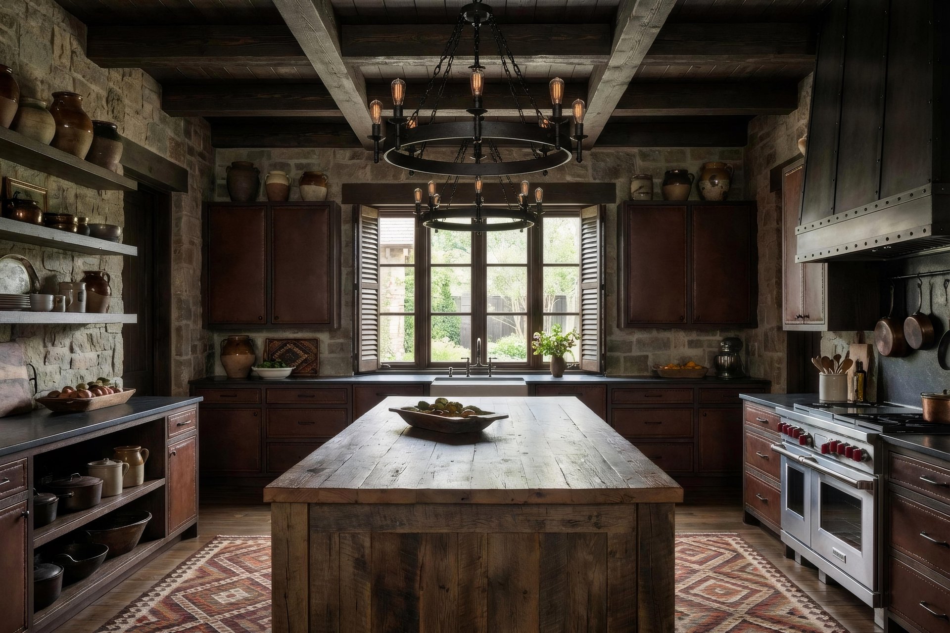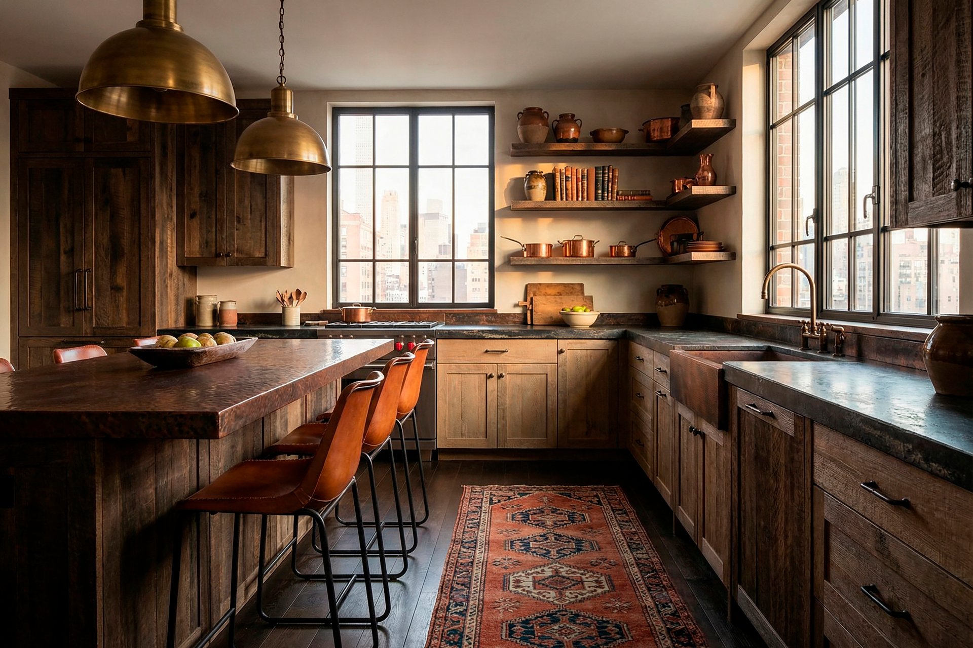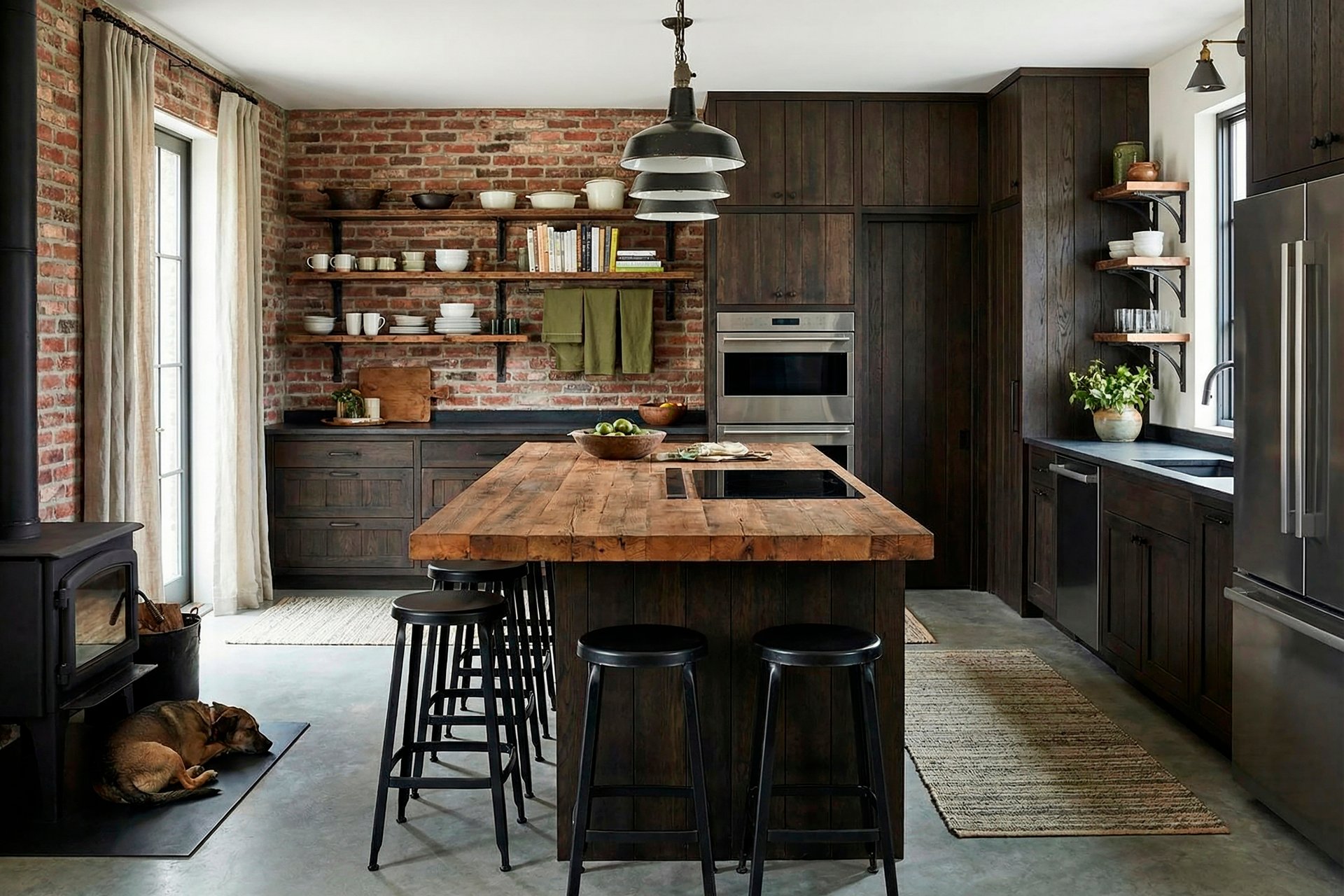 Смесь деревенского уюта и городской индустриальности. Дерево, текстиль и филенки сочетаются с кирпич, черным металлом, простыми светильниками и открытыми полками на брутальных кронштейнах. Цвета чуть строже: серый, графит, оливковый, теплый белый. Техника и фурнитура могут быть более современными, но на фоне остается ощущение «живой» кухни, а не чистого лофта.