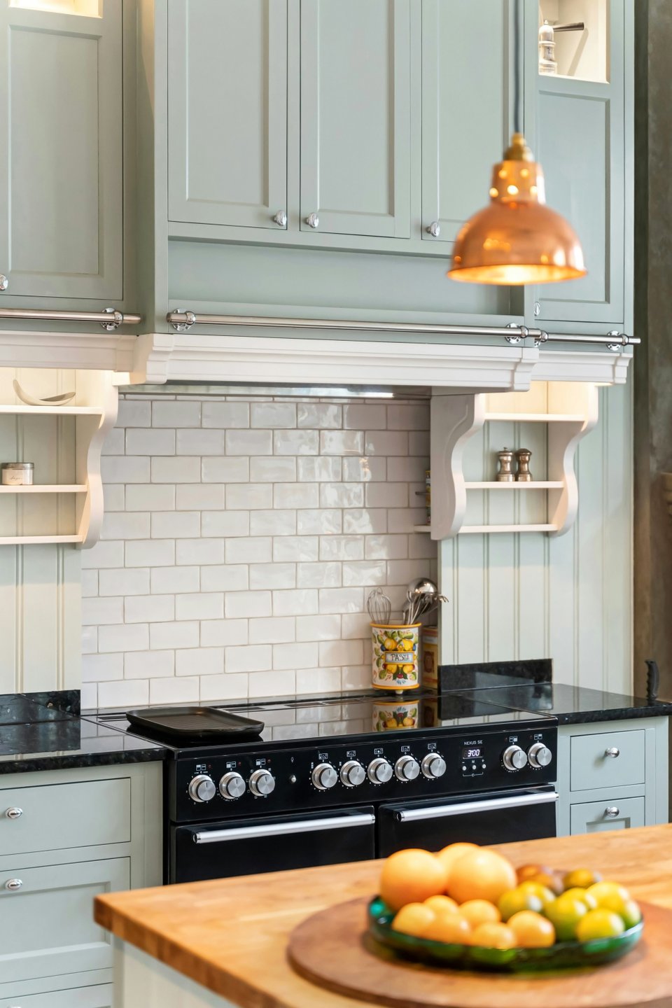 Компромисс между классикой и современностью. Мягкие оттенки с бежевым или зеленым подтоном смотрятся спокойно и благородно и хорошо маскируют бытовые следы. На таком фоне можно позволить себе более выразительный фартук или акцентную технику в ретростиле. Важно, чтобы серый был теплым или нейтральным, без синевы — иначе кухня может казаться холодной.