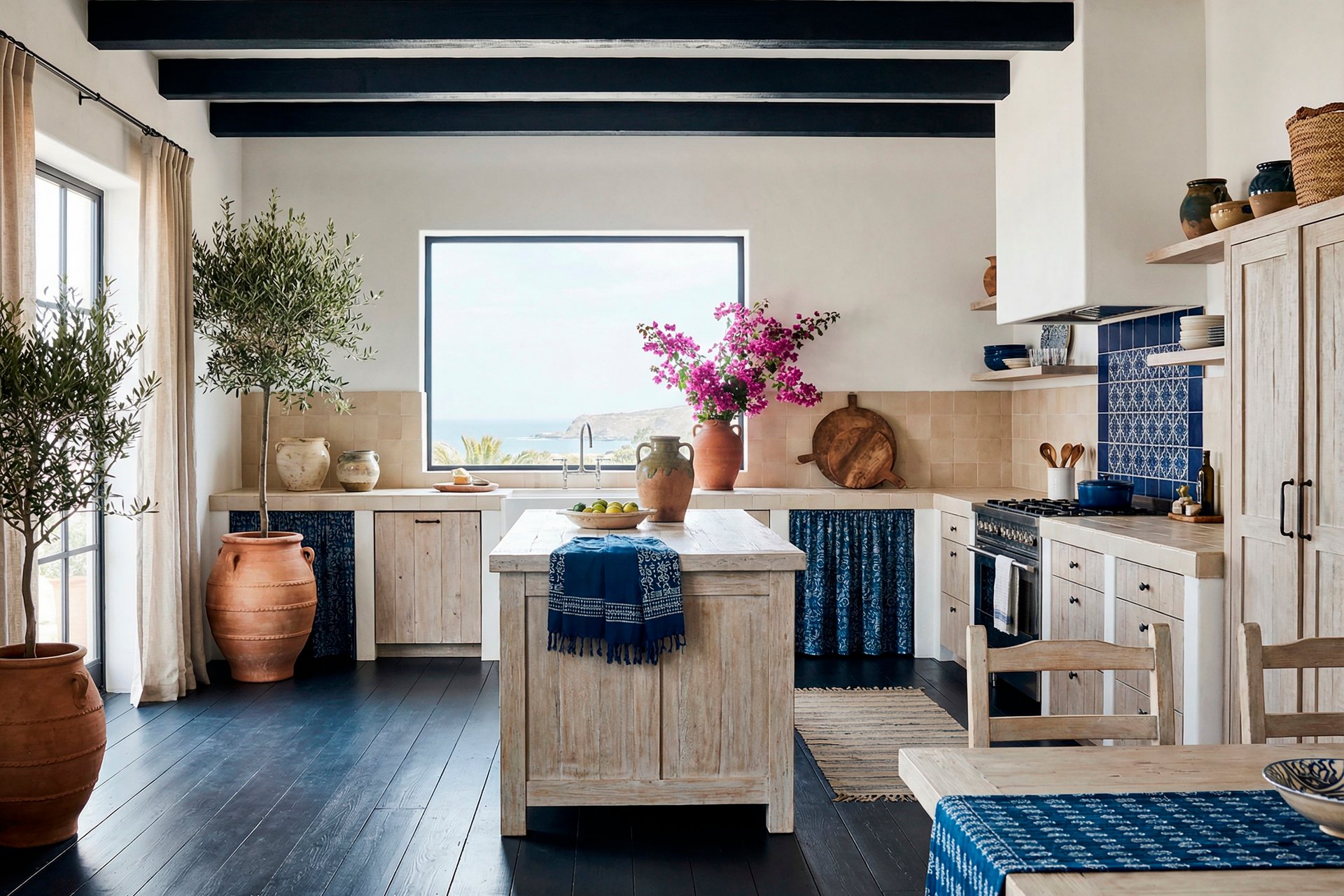 Такая кухня хранит атмосферу побережья, мечтаний и теплых встреч. Если из прованса убрать декор, добавив белого, голубого и песочного оттенков, выкрасить пол и балки на потолке в темный цвет, купить светлую мебель и большие растения в кадках — получится кантри в духе средиземноморья.