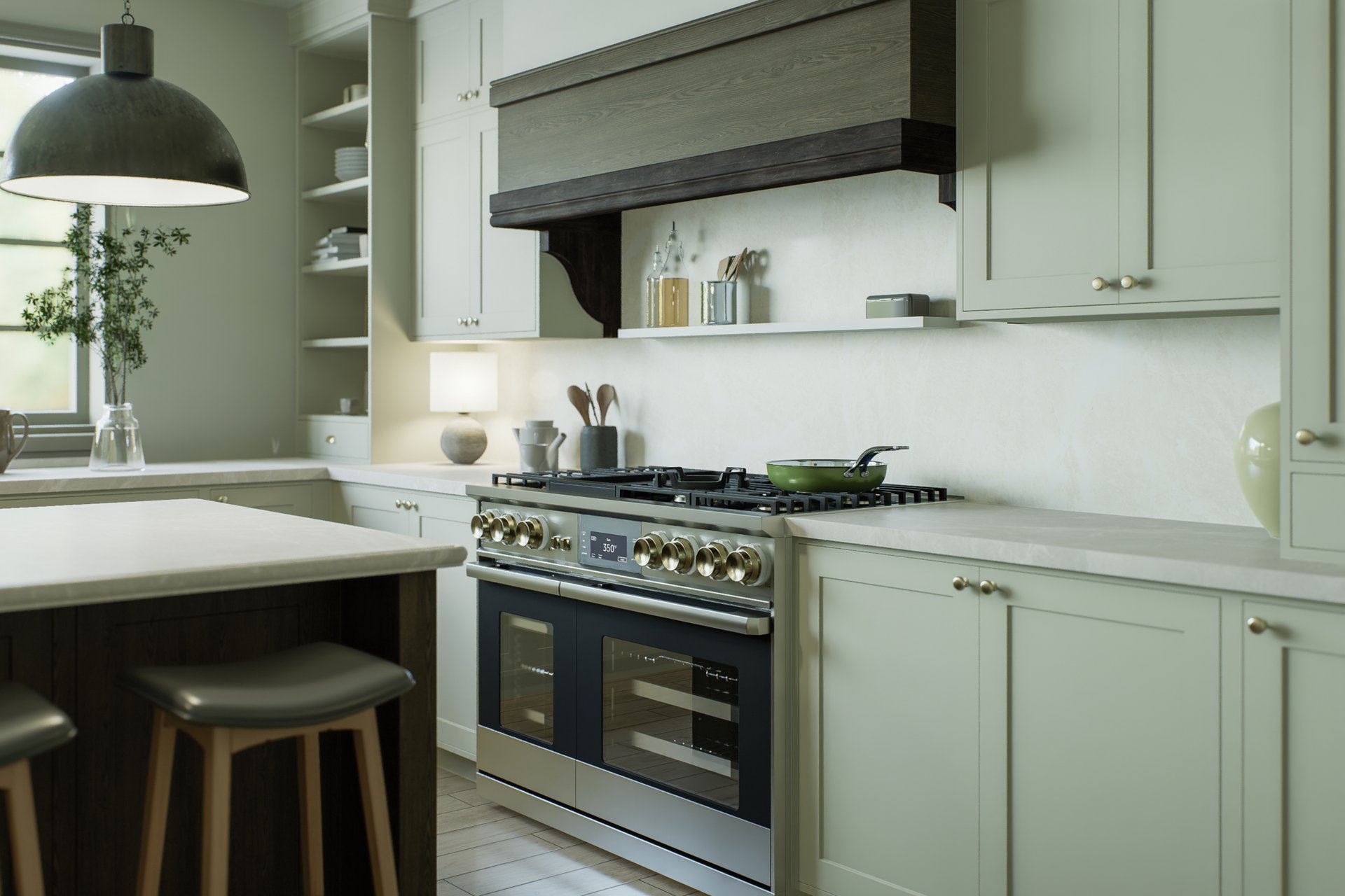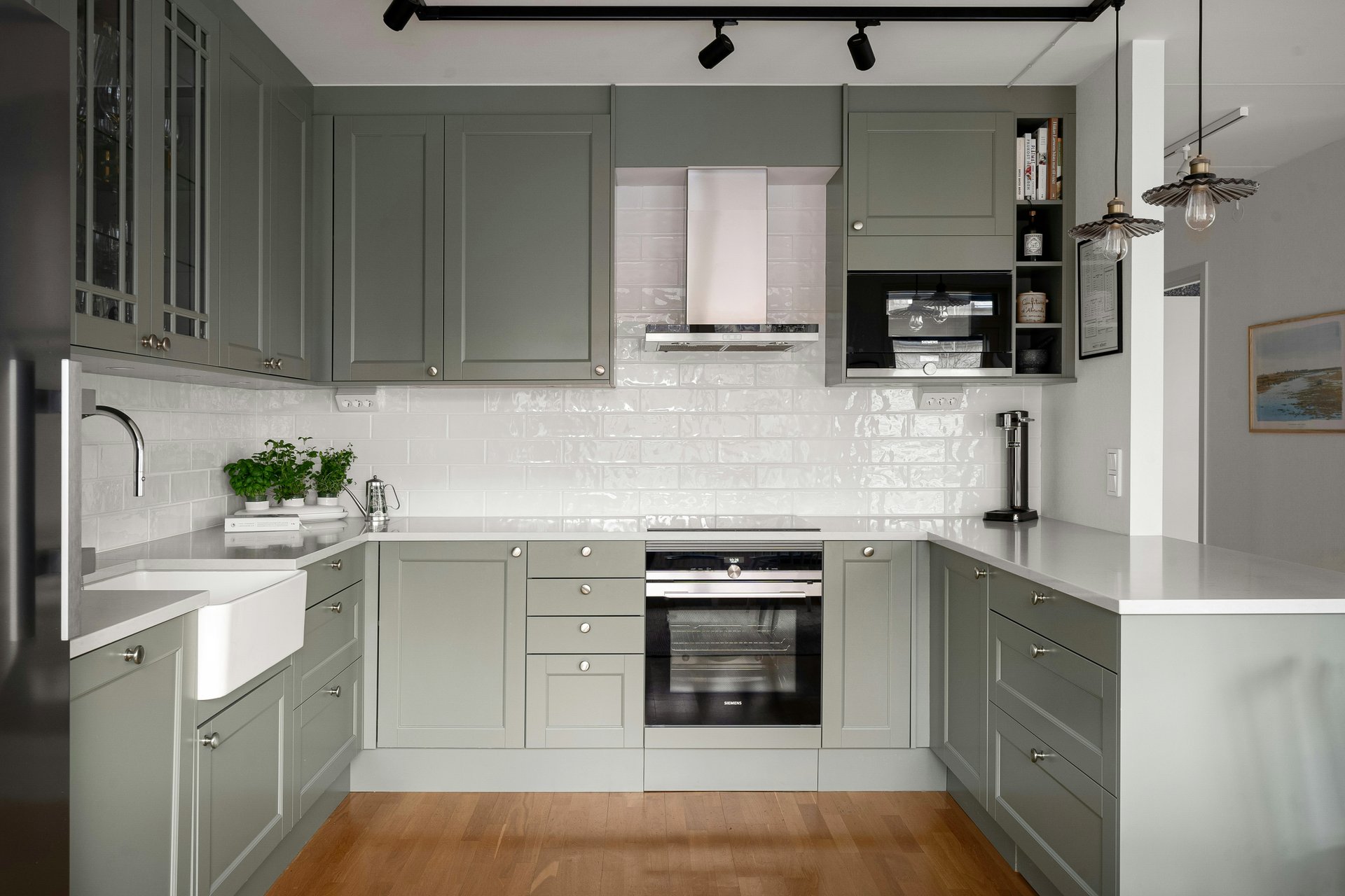 Отсылают к природе и саду. Особенно популярны оливковые, шалфейные, серо-зеленые тона: они мягкие, не утомляют и создают ощущение «живого» пространства. Такие оттенки идеально сочетаются с теплым или состаренным деревом, бежевой плиткой, керамикой, плетеными корзинами. Зеленый хорошо работает как основной цвет фасадов, а стены и фартук можно сделать более нейтральными. Главное — избегать кислотных тонов: они выбиваются из эстетики и быстро утомляют.