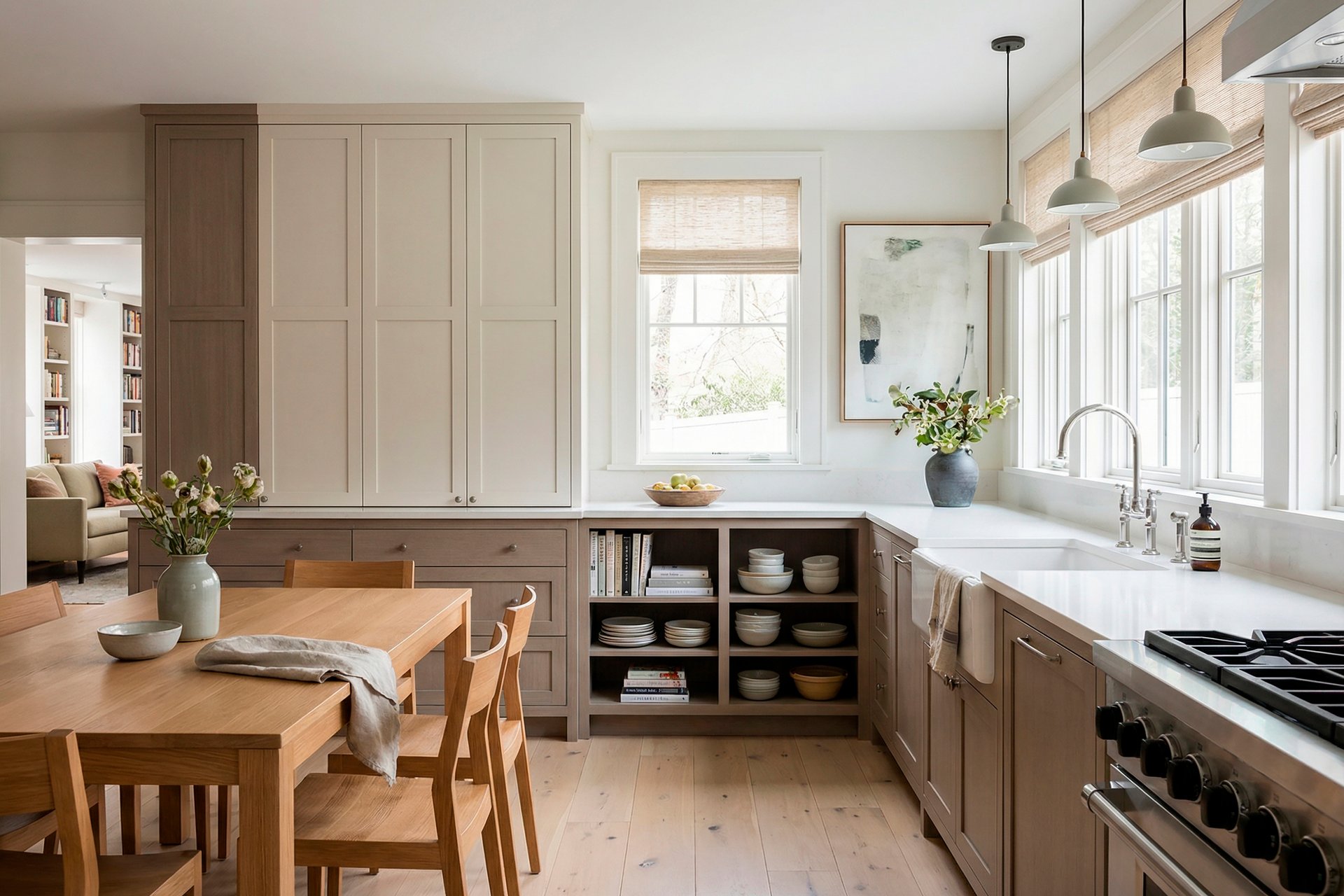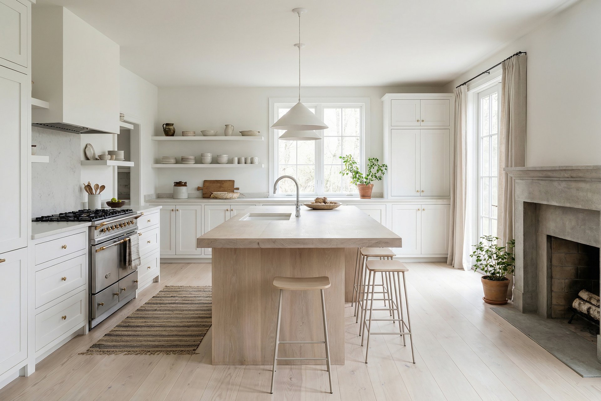 Это обилие света и простора, лаконичных форм и продуманной функциональности. Здесь много белого и светлых оттенков, природное дерево (часто выбеленное), минимум декора и простые, почти аскетичные формы. В результате кухня выглядит домашней, но при этом визуально просторной и современной.