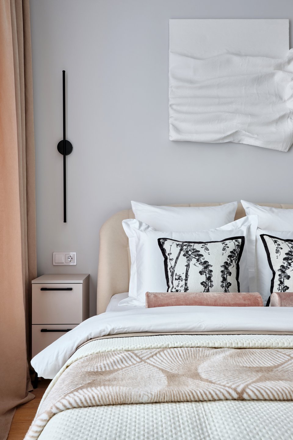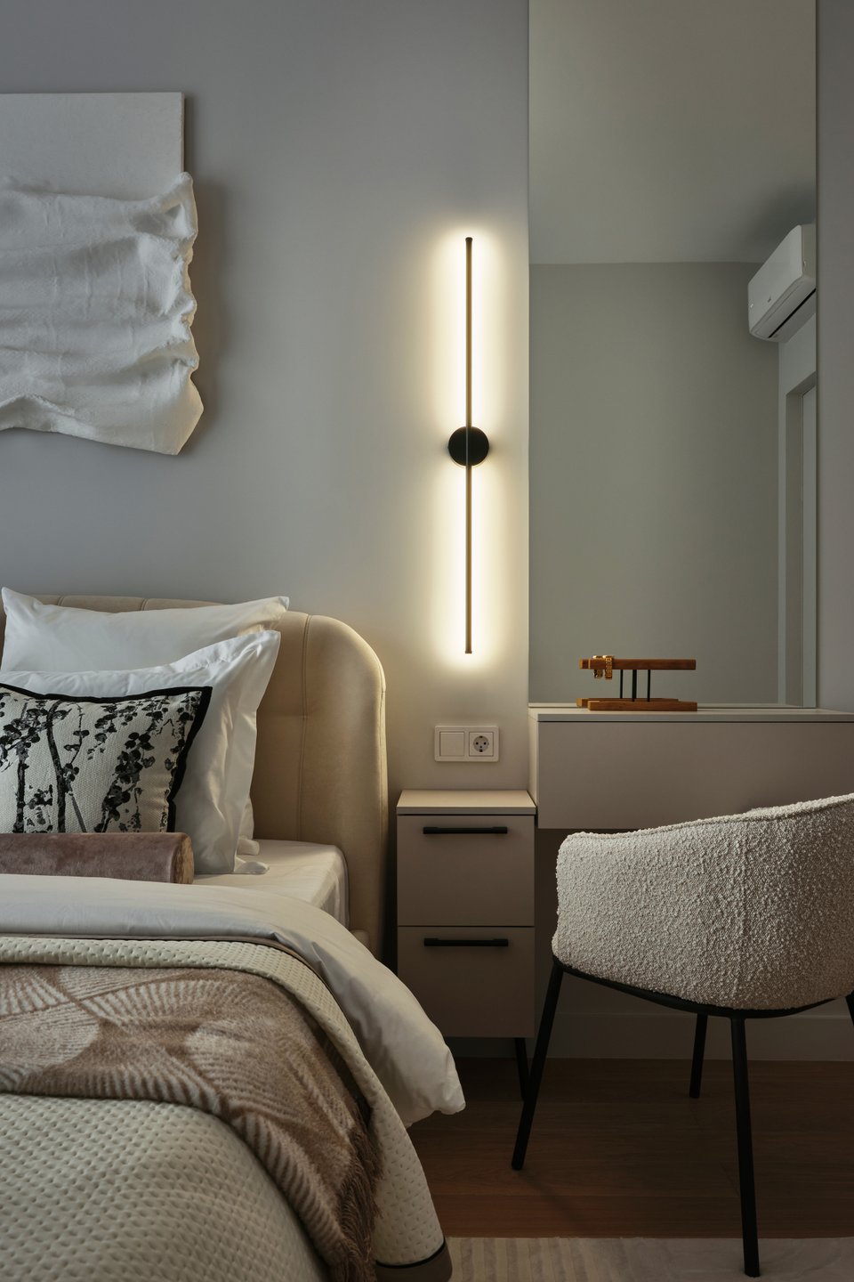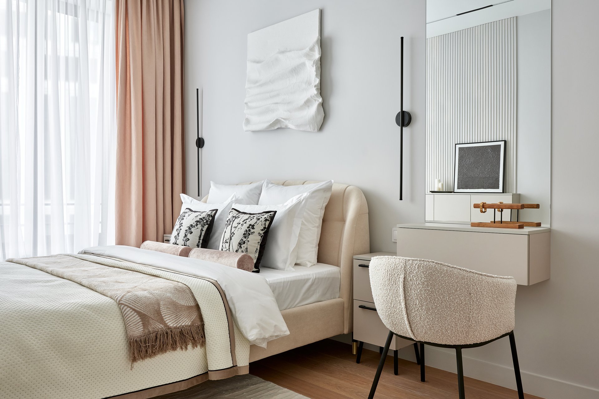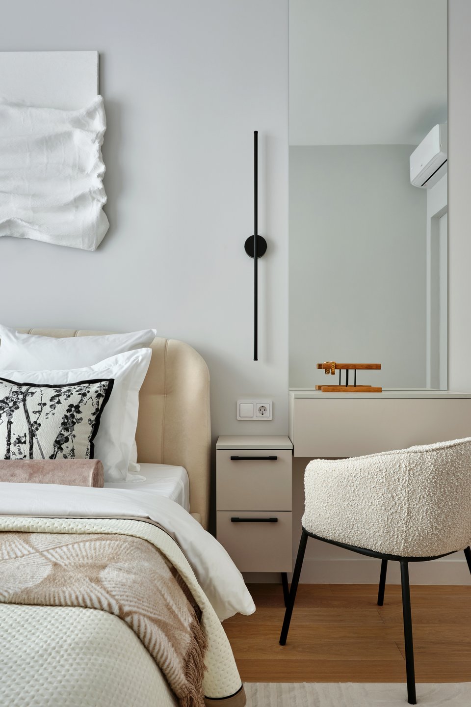 Кровать Льери и объемное панно над изголовьем — основные акценты в комнате. Нам нужна была кровать на ножках, с подъемным механизмом и красивым мягким изголовьем плавной формы. Подходящую быстро нашли в divan.ru. Там же заказали матрас Sleeper для комфортного отдыха. Добавили две прикроватные тумбы, туалетный столик и бра на стену, от застройщика их не было».