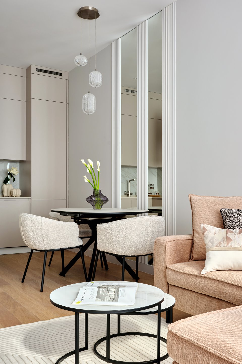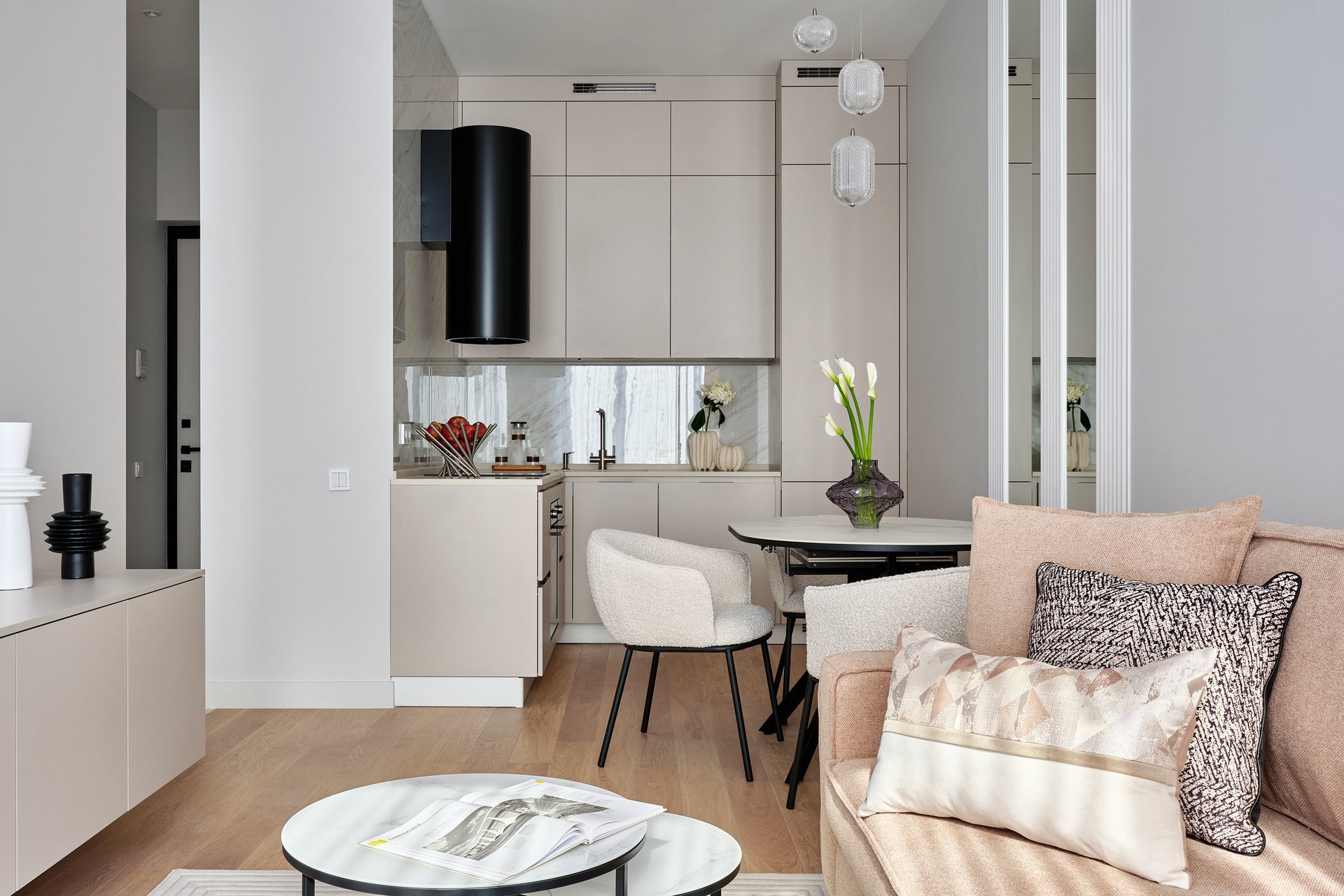Дизайнеры Юлия Квитченко и Юлия Белькова создали уютный и функциональный интерьер евродвушки, не прибегая к перепланировке. Цвет стен от застройщика изменили, добавили декоративные панели, выкрашенные той же краской, и зеркала. Смотрим, что получилось.