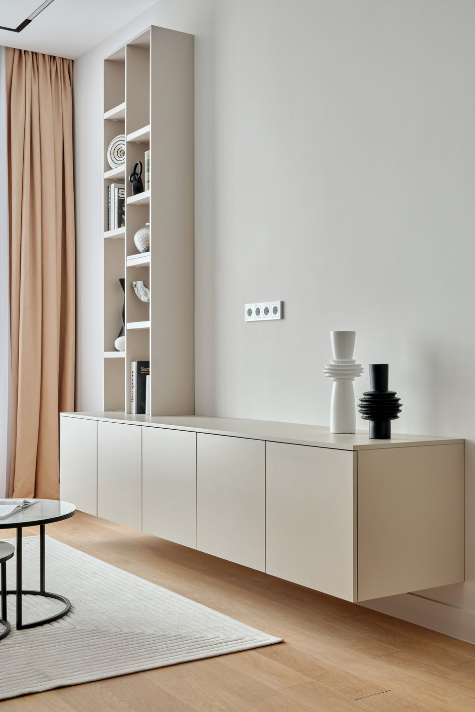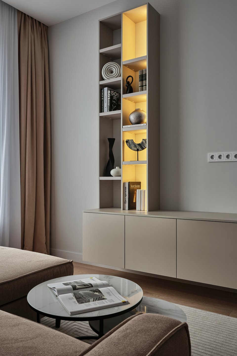 Шторы подобрали в цвет дивана. Тумбу под ТВ изготовили на заказ — довольно объемную, чтобы обеспечить дополнительное место для хранения. В комнате несколько сценариев освещения: трековые светильники, подвес над столом, подсветка штор и открытых полок, торшер для вечернего уюта.