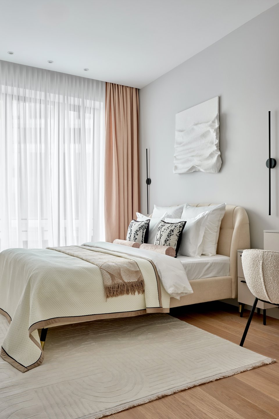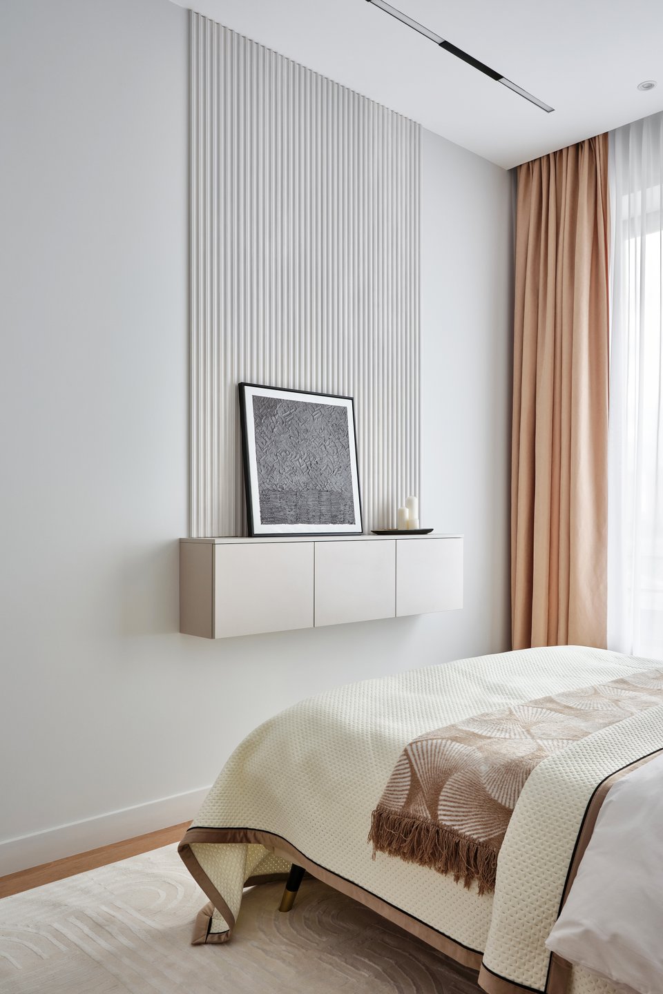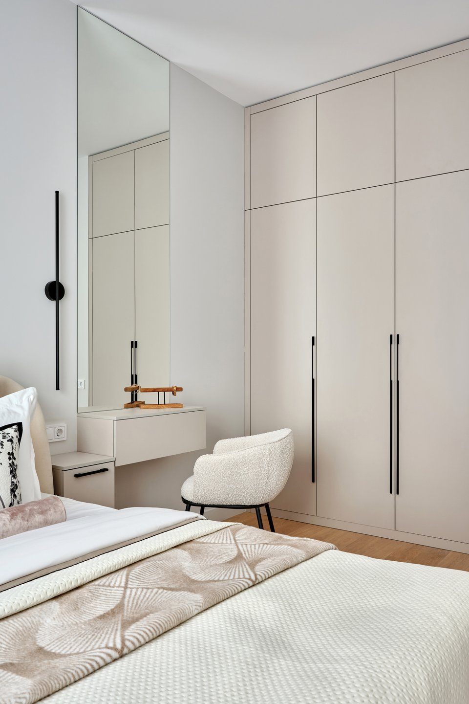 Отделка спальни полностью совпадает с гостиной. «Изначально в помещении была ниша, в которую просился шкаф, — комментируют дизайнеры. — Его изготовили на заказ, от стены до стены и в потолок. В нише был выключатель освещения. Его перенесли на другую стену, чтобы установить мебель.