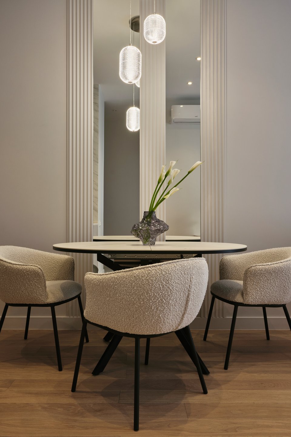 «В проекте много зеркал, — рассказывают дизайнеры. — Особенно выигрышно смотрится комбинация стеновых панелей и зеркал у обеденного стола. В последних красиво отражается многоярусный светильник. Такая композиция проста в исполнении и относительно бюджетна».