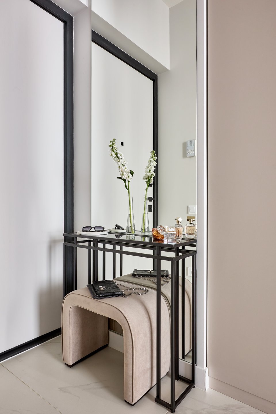 Шкаф изготовили на заказ и встроили в имеющуюся нишу. Другого места для него здесь не предусмотрено. Добавили зеркало, консоль и пуф.