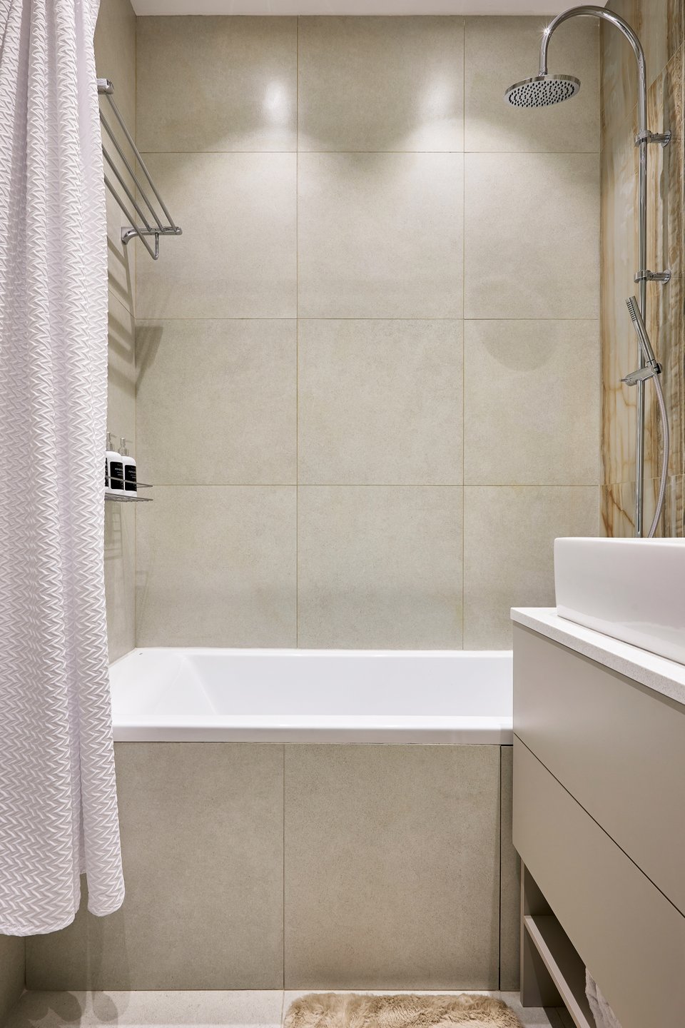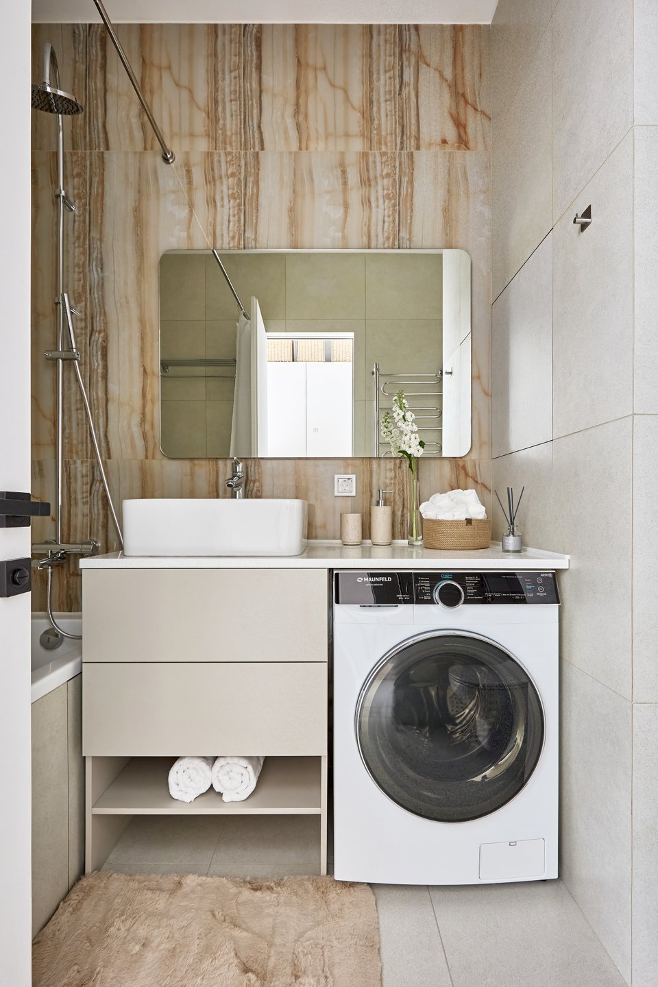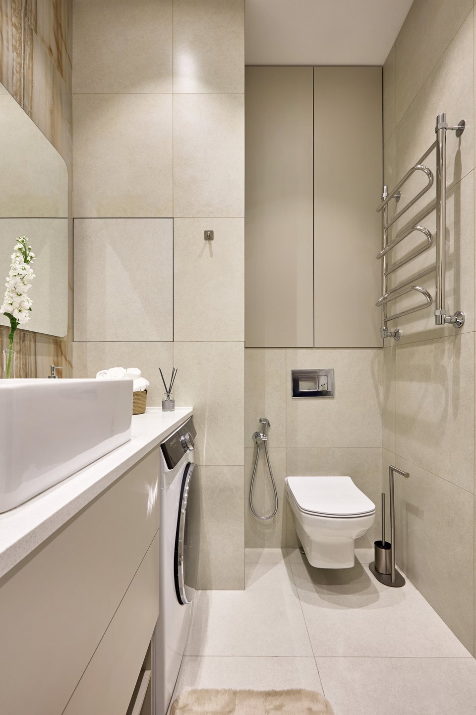 В санузле оставили отделку от застройщика. Тумбу, шкаф над инсталляцией и цельную каменную столешницу изготовили на заказ. Раковина осталась от застройщика.