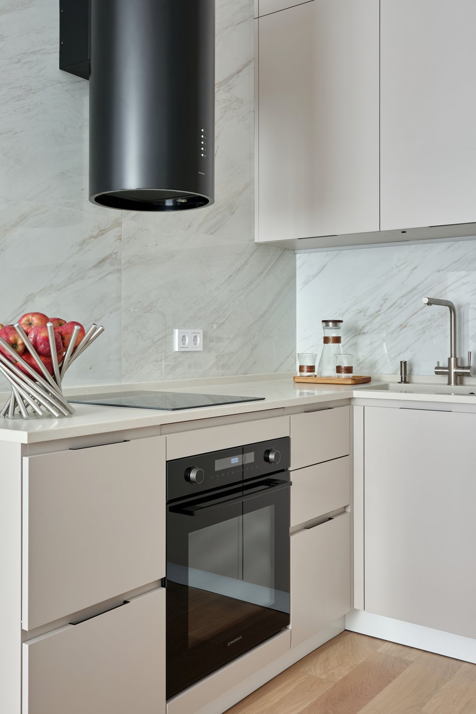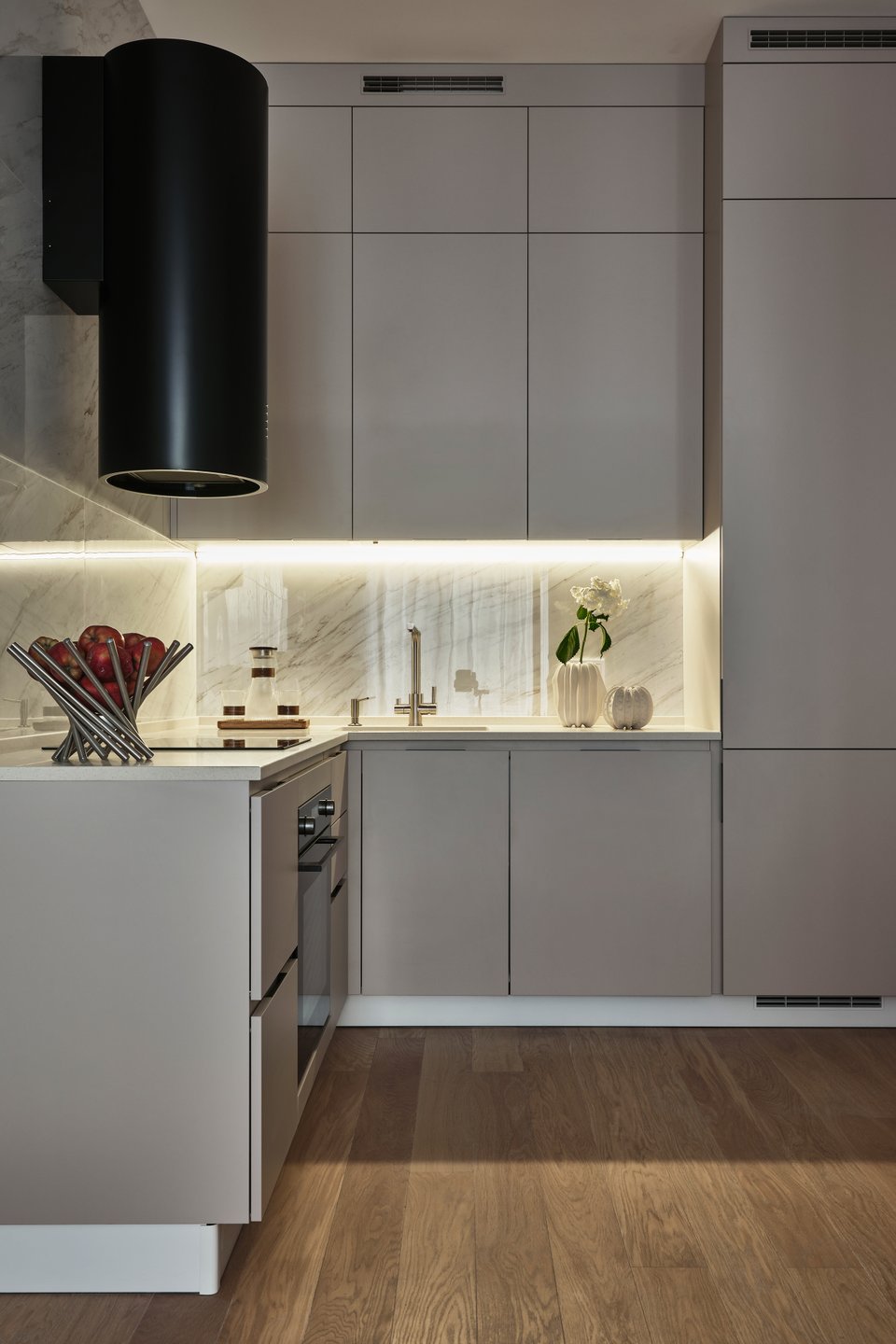 Владельцы просили, чтобы кухня (конкретно зона готовки) не выделялась на общем фоне и выглядела как часть гостиной. Добились этого за счет лаконичных гладких фасадов со скрытыми ручками и общей цветовой гаммы обеих зон. Верхние шкафы не стали делать полным углом, дублирующим нижние, чтобы не утяжелять пространство.