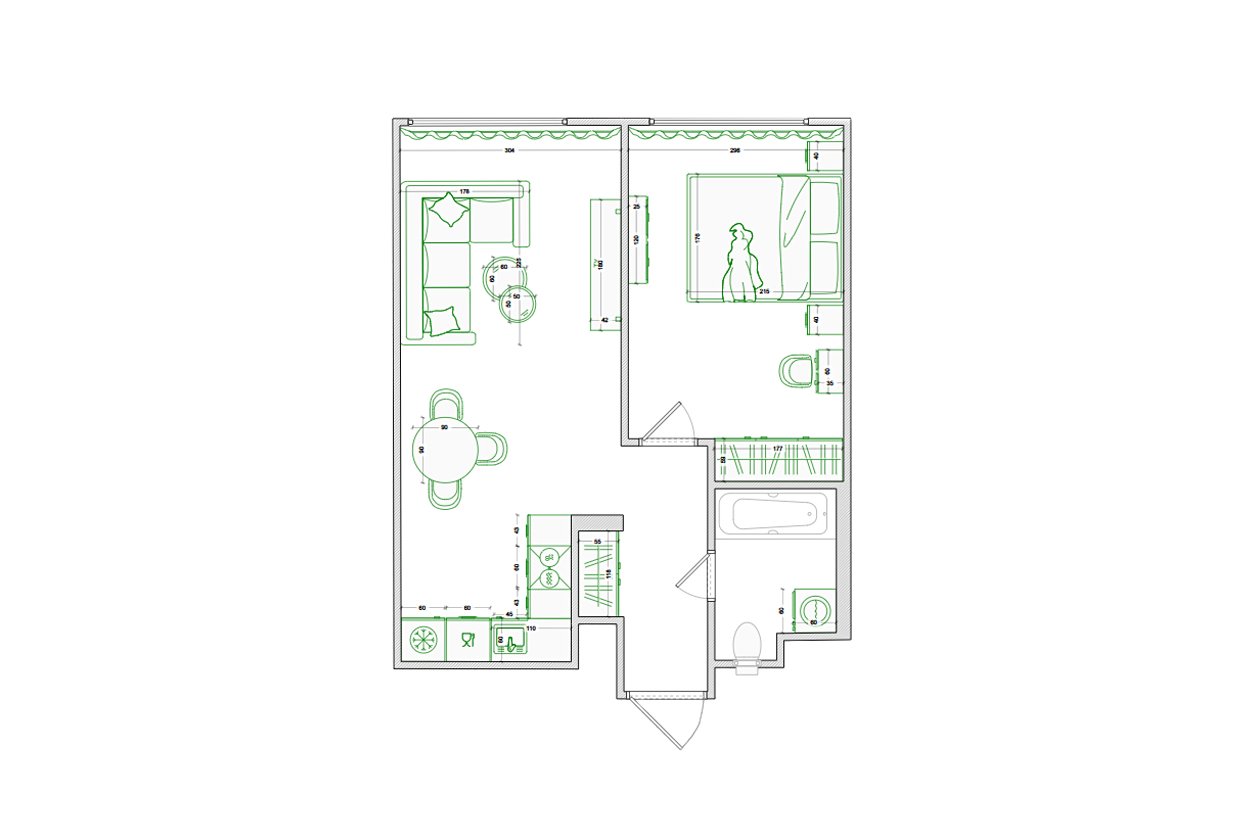 Квартиру приобрели с чистовой отделкой от застройщика (пол, стены, потолок, плитка в санузле, унитаз, ванна и раковина). Планировочное решение подходило под цели заказчика, поэтому все зоны оставили на своих местах. В квартире есть кухня-гостиная и изолированная спальня, совмещенный санузел и небольшая прихожая.