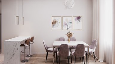 К столу подобрали мягкие стулья на черном металлическом основании. Люстру над столом вешать не стали, чтобы не привязывать обеденную группу к определенному месту.