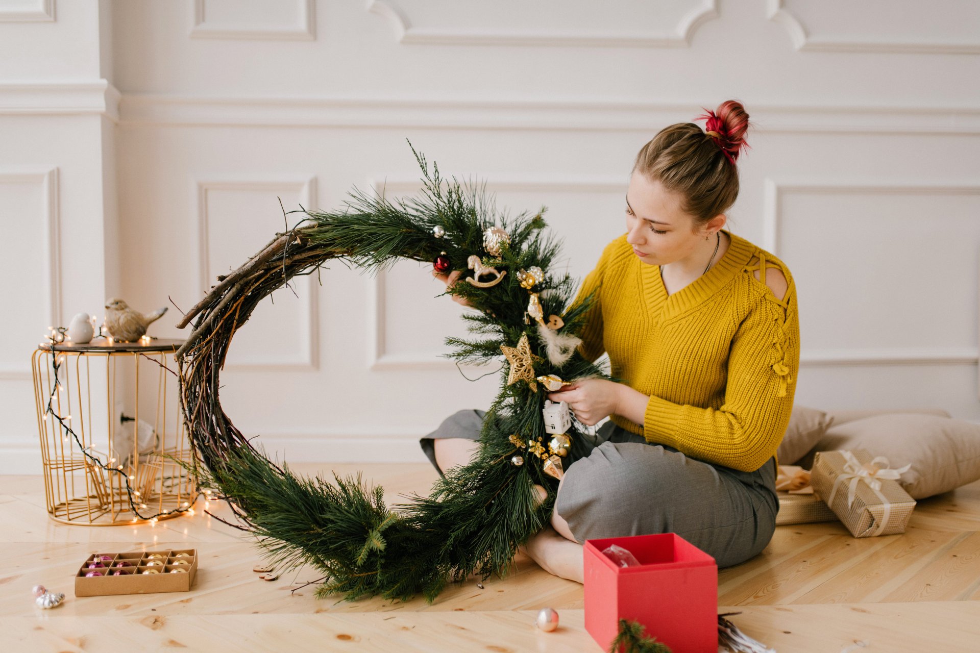 Отодвиньте немного кровать от стены, разложите еловую ленту и слегка прижмите декор изголовьем, чтобы украшение не падало на вас во сне.